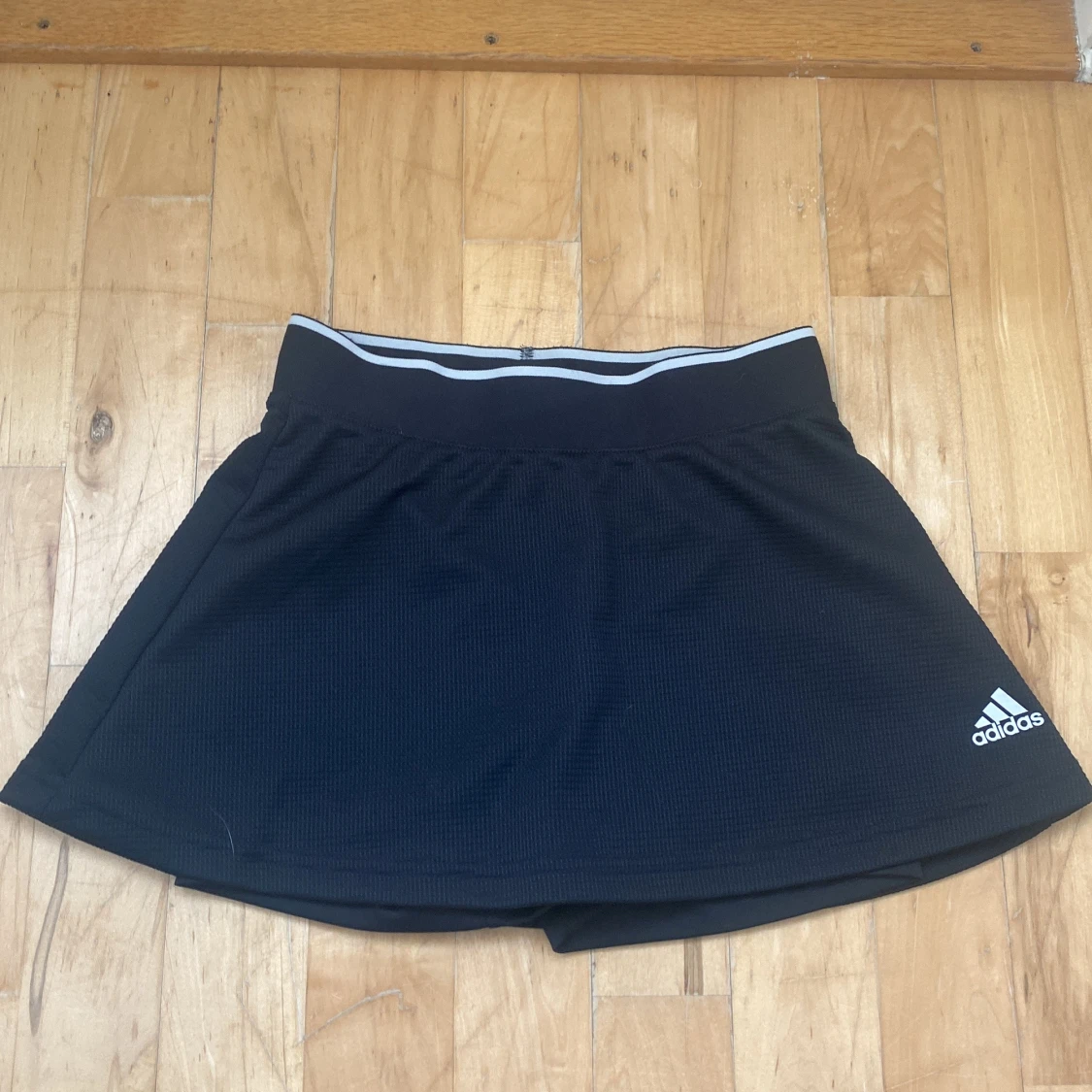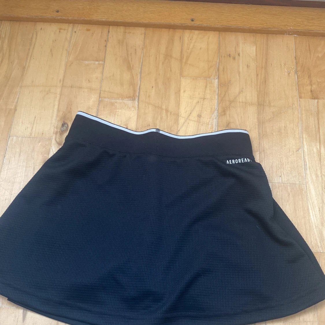 Svart kortkjol från Adidas med inbyggda shorts och elastisk midja med vit rand. Materialet är lätt och andas, perfekt för tennis eller träning. Diskret Adidas-logga i vitt framtill och Aeroready-tryck bak. Snygg och funktionell för aktiva dagar.