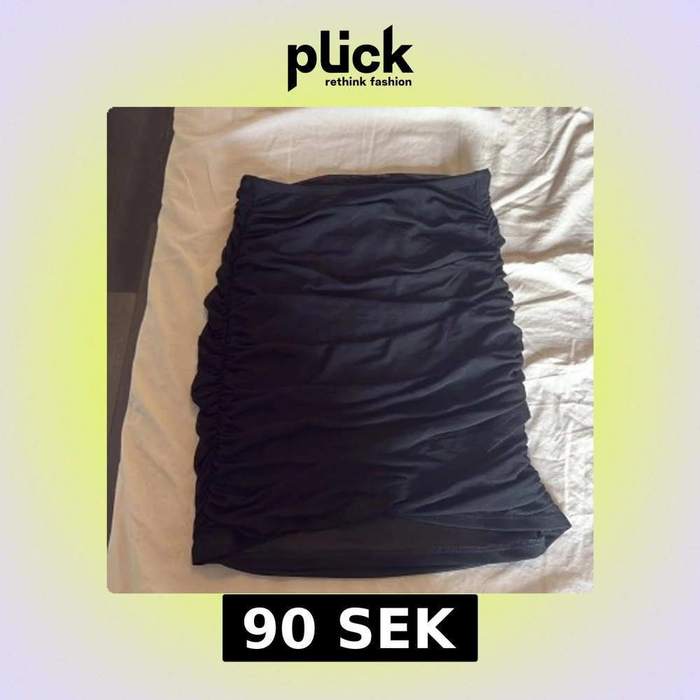 Svart kortkjol från SHEIN i storlek S. Kjolen har en tight passform och är snyggt rynkad på sidorna för en trendig look. Tillverkad i ett stretchigt syntetmaterial som sitter skönt och formar sig efter kroppen.
