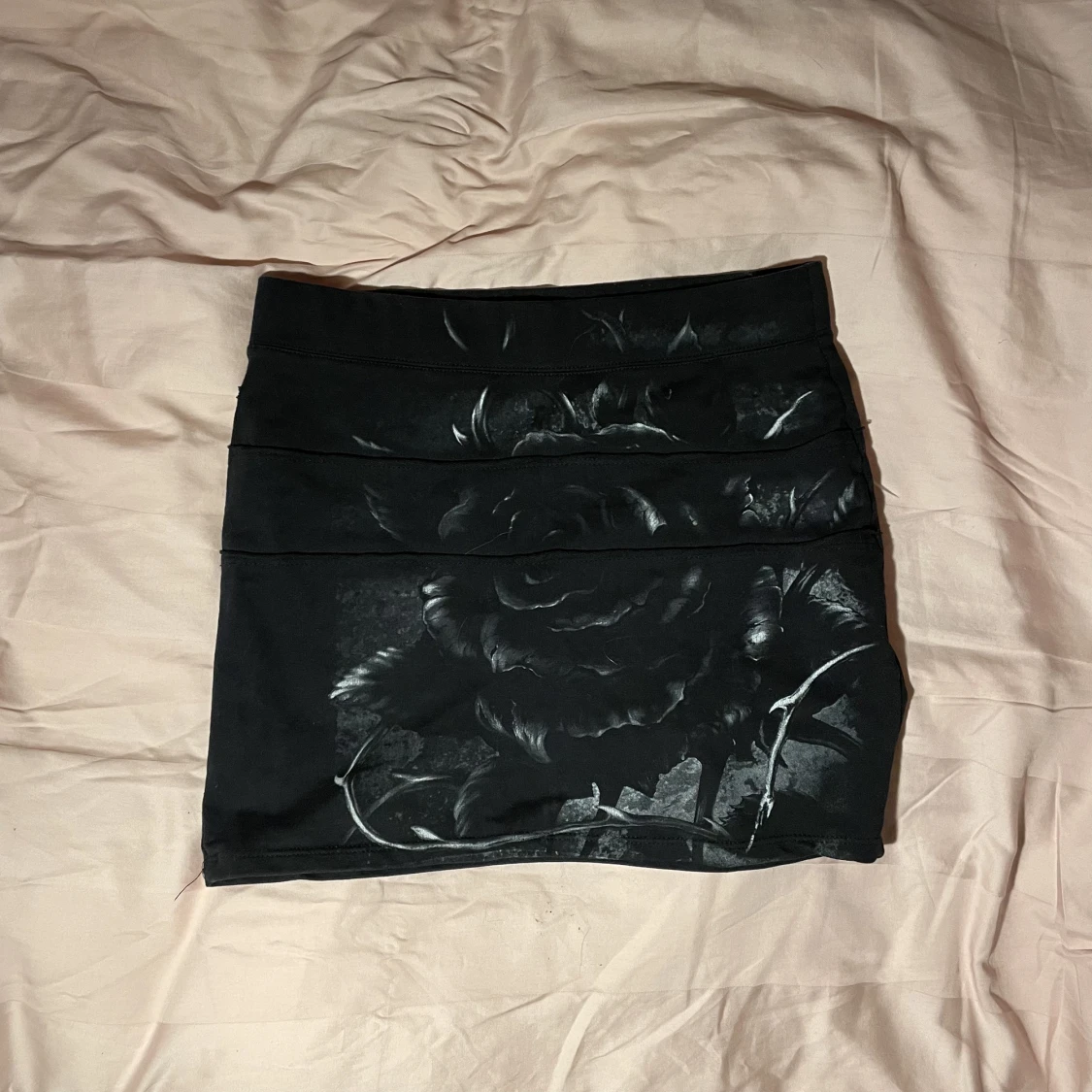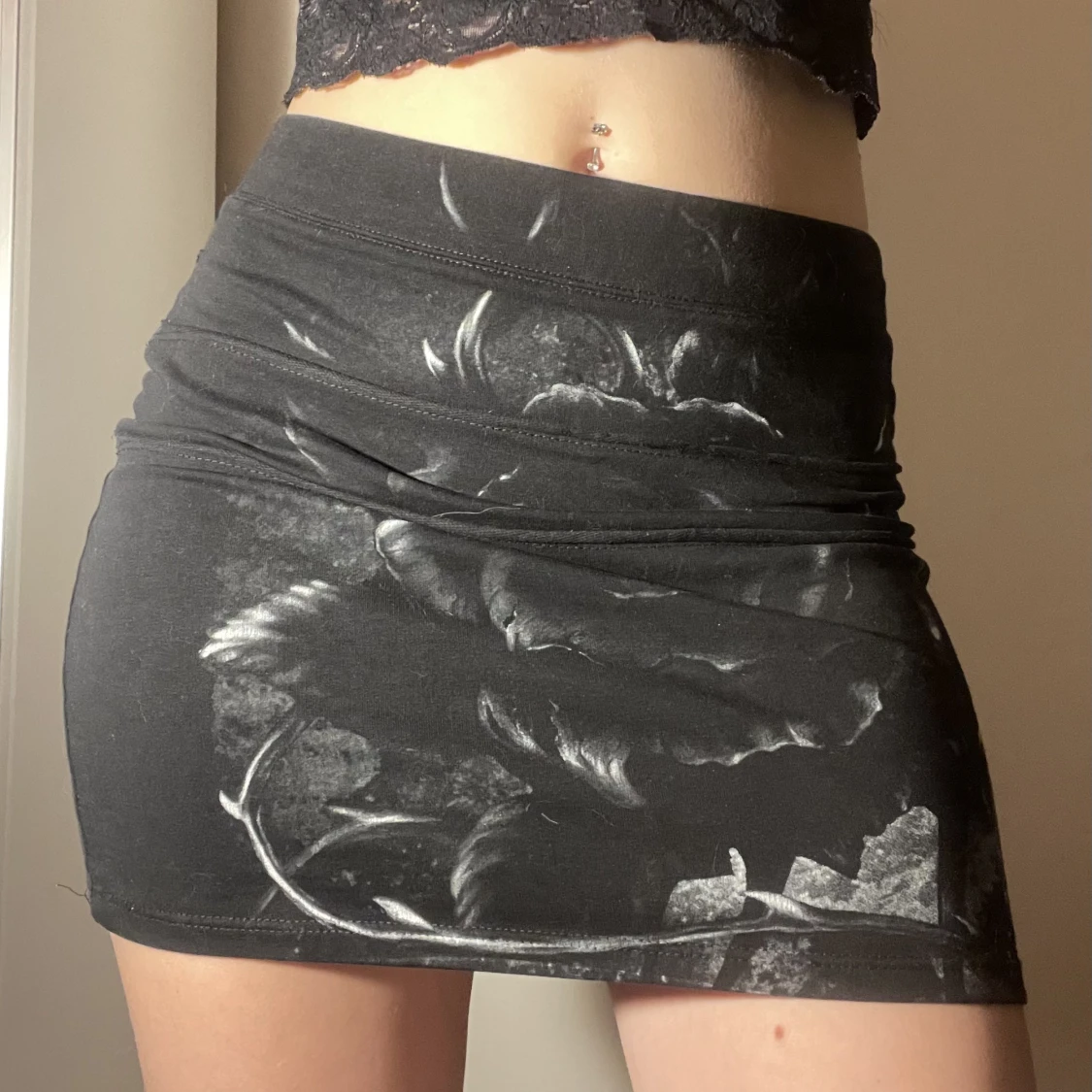 Kort tight svart kjol med tryck av en vit ros. Passar mig som har storlek s-m och är 165 cm. 35 cm uppifrån och ner. Skönt stretchigt material, fint skick utom ett litet hål i övre högra hörnet (skriv för bild). Kan mötas nära Mariatorget eller posta.