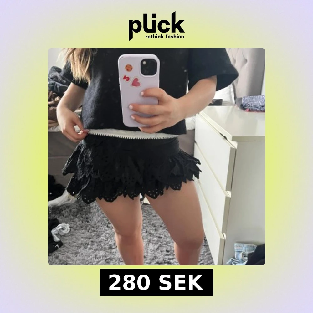 Supersöt svart kjol från Zara med flera lager volanger och broderade detaljer. Kjolen är kort och har en feminin, lekfull look med fina utskurna mönster i tyget. Perfekt att styla med en enkel topp för en trendig outfit.