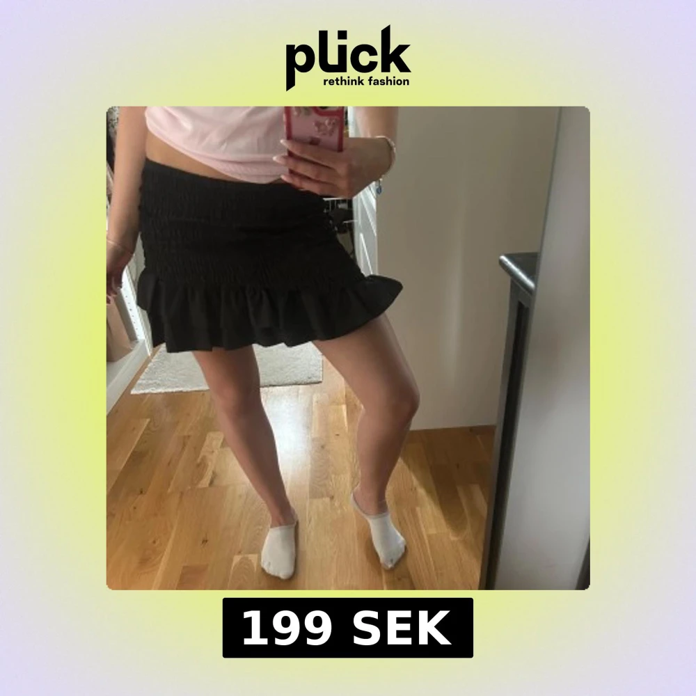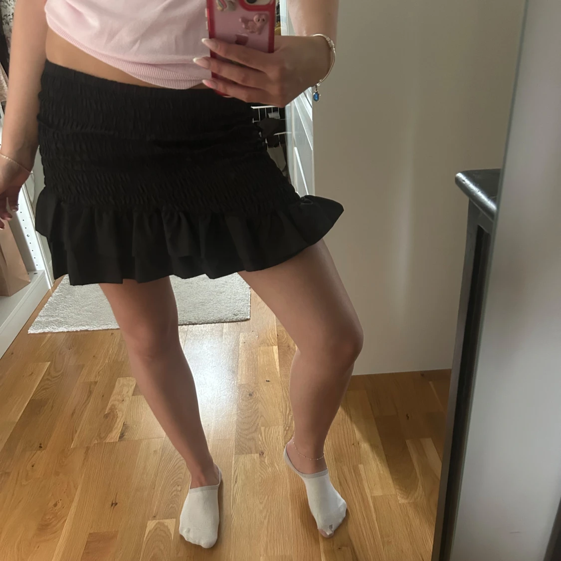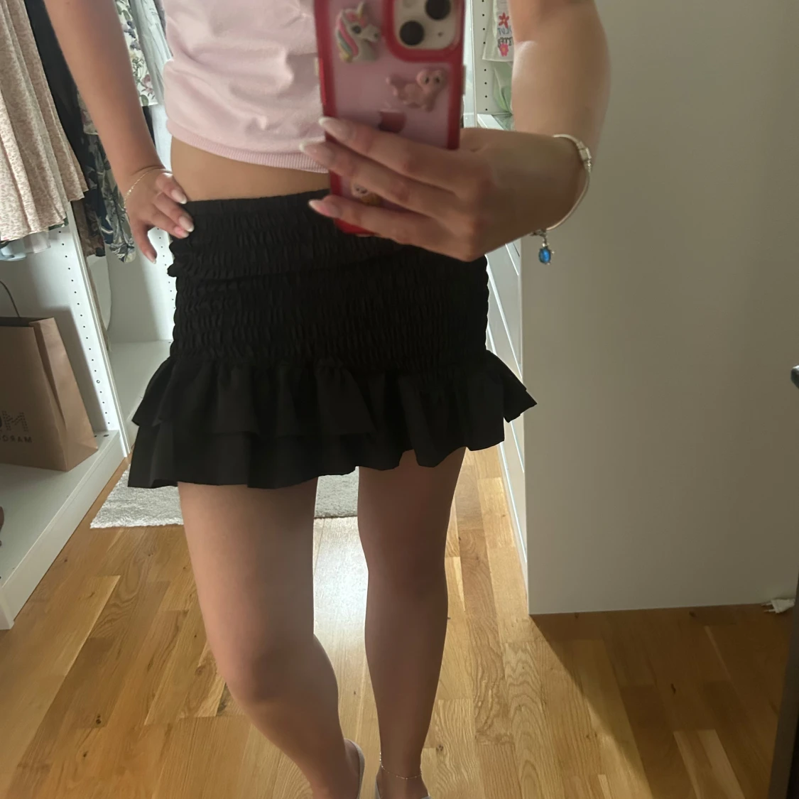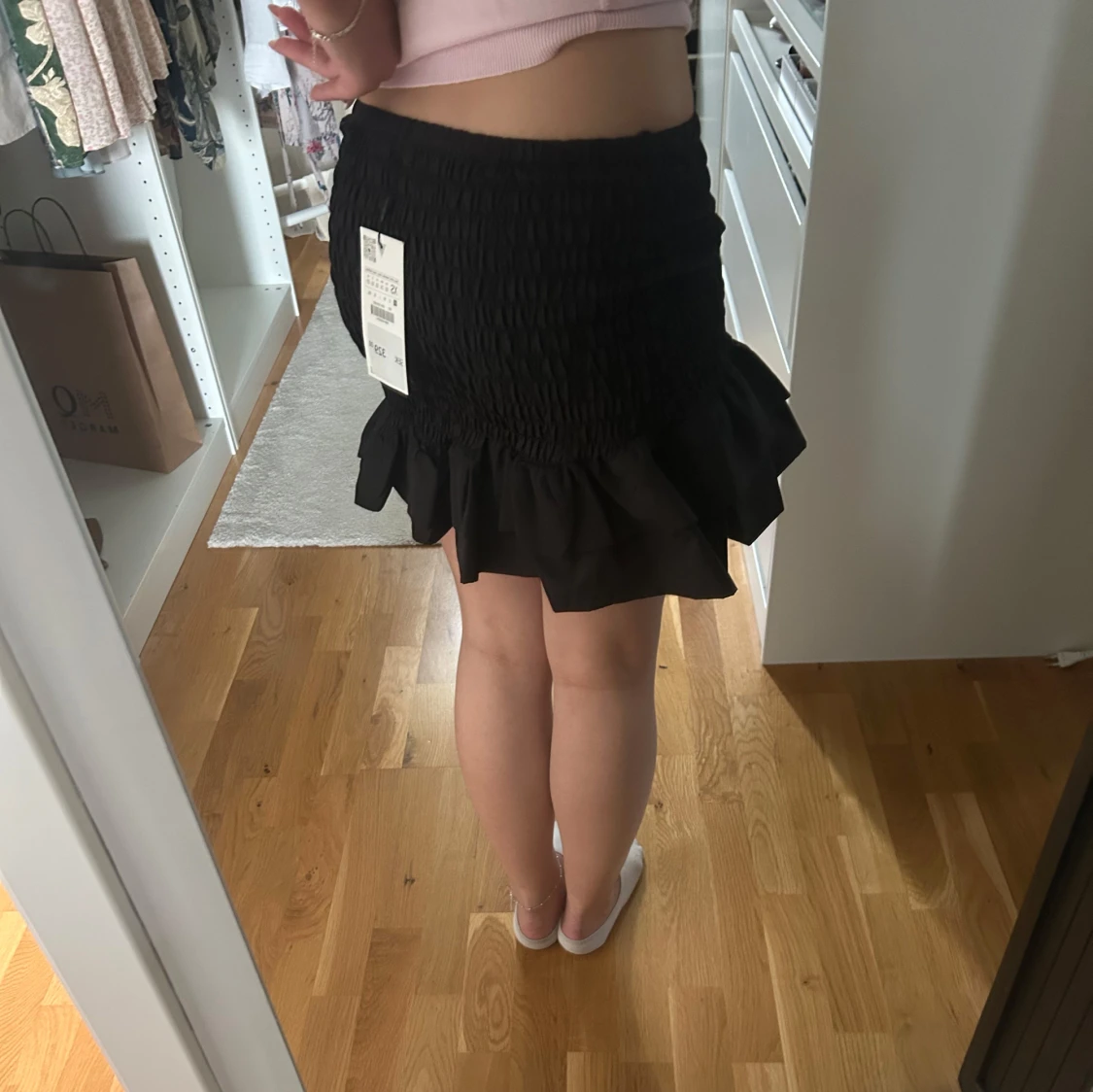 Supersöt svart lågmidjad kjol med smock i midjan och volang nertill. Kjolen har en figurnära passform upptill och är perfekt att styla med en enkel topp. Bekväm och stretchig modell. 💗Helt ny, aldrig använd, nypris 399