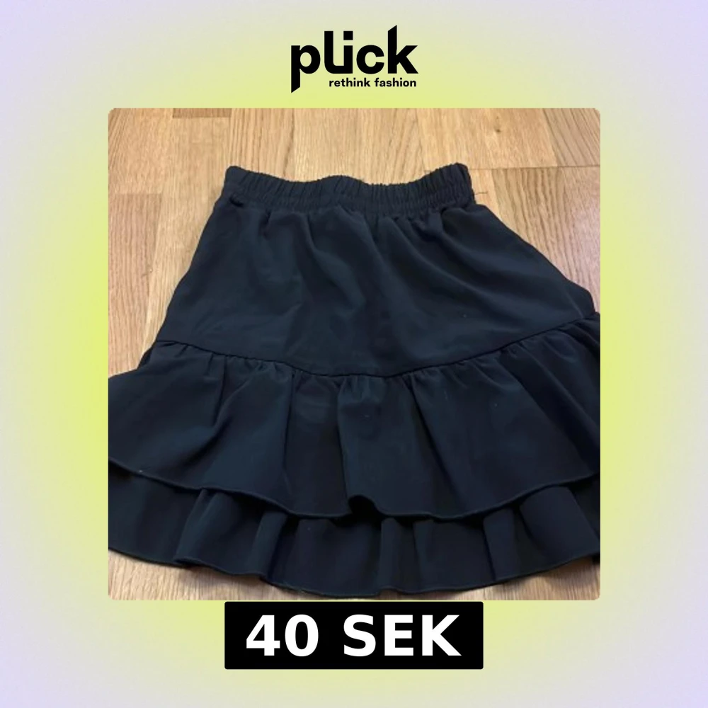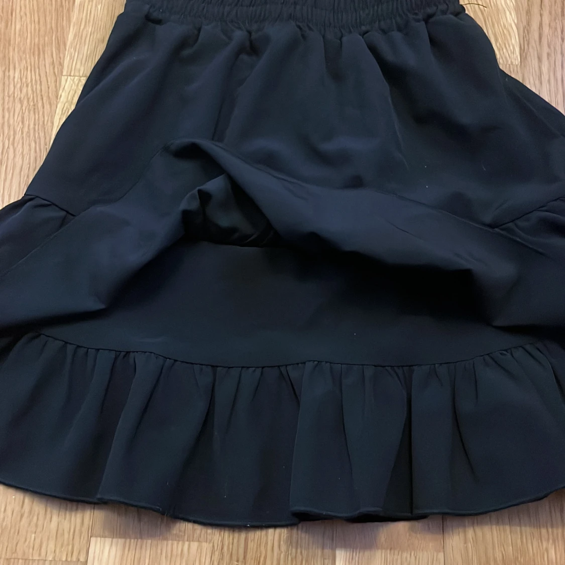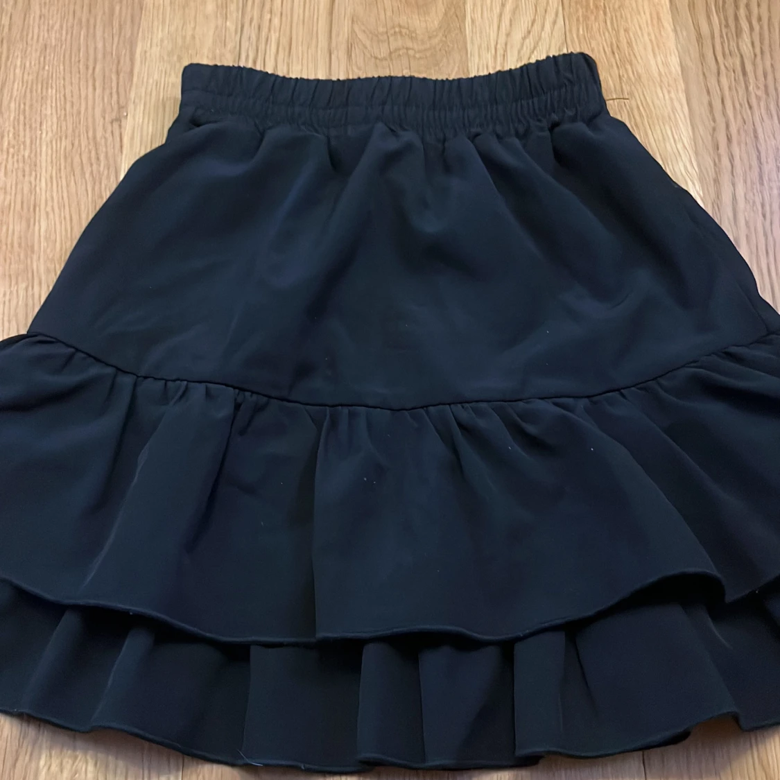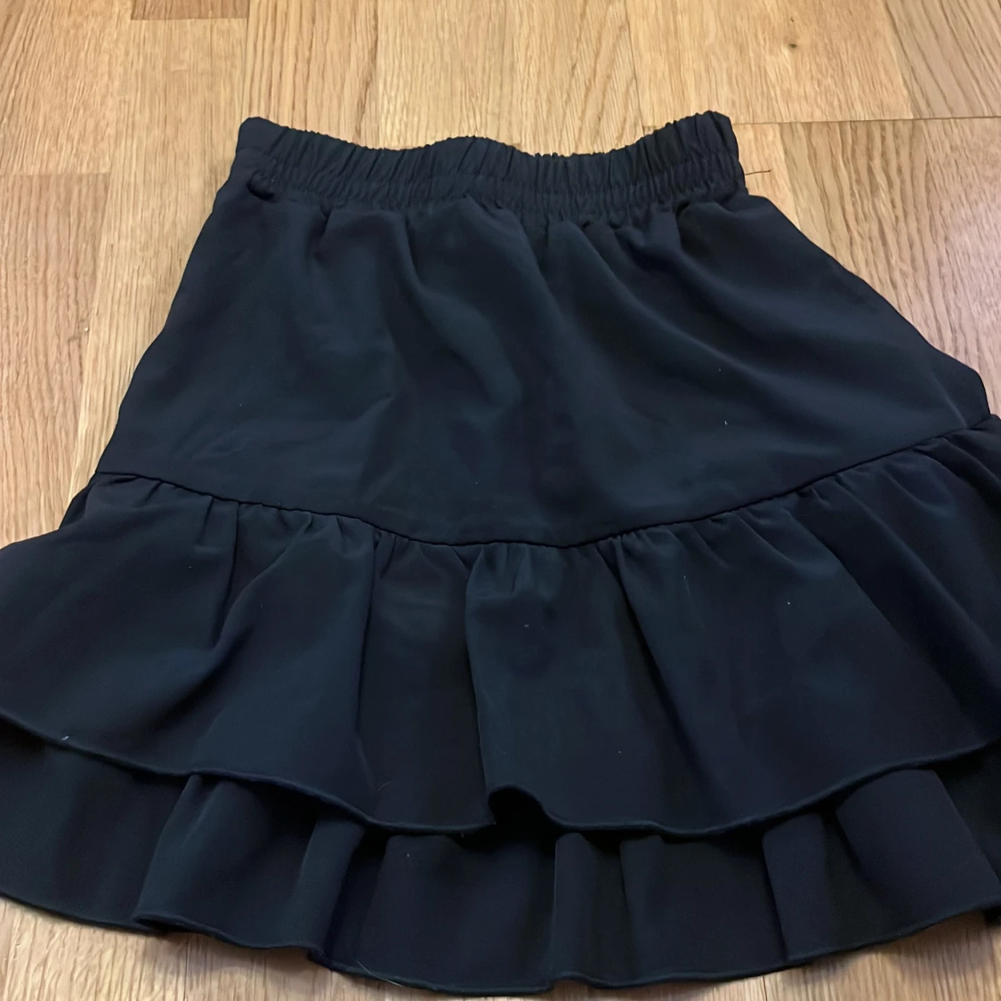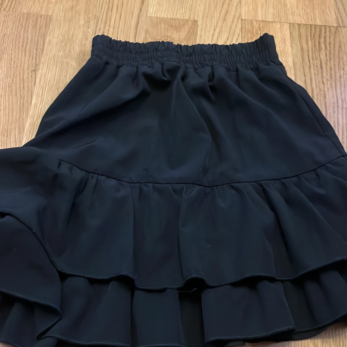 Supersöt svart kortkjol med dubbla volanger och bred resår i midjan för en bekväm passform. Kjolen har en flowy känsla och passar perfekt till sneakers eller boots. Enkel att matcha och ger en cool vibe till din outfit.