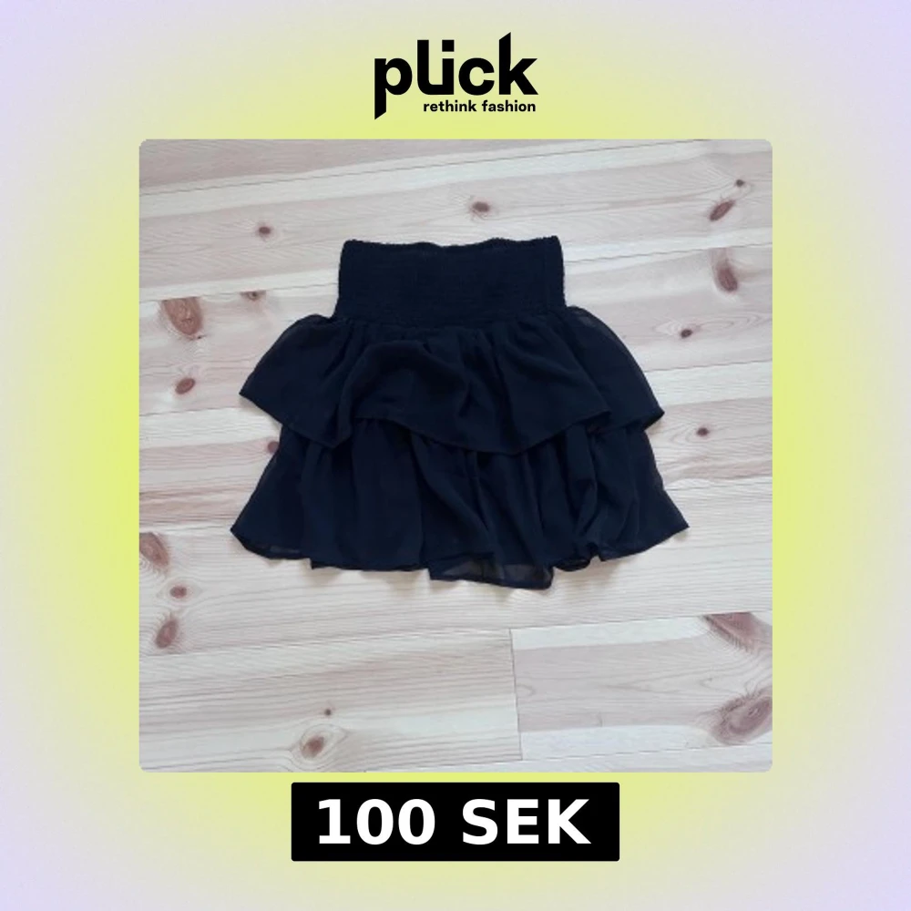 Supersöt svart kortkjol med dubbla volanger och bred smock i midjan. Kjolen är luftig och har en flowy känsla, perfekt för att skapa en cool och trendig look. Passar lika bra till sneakers som boots.