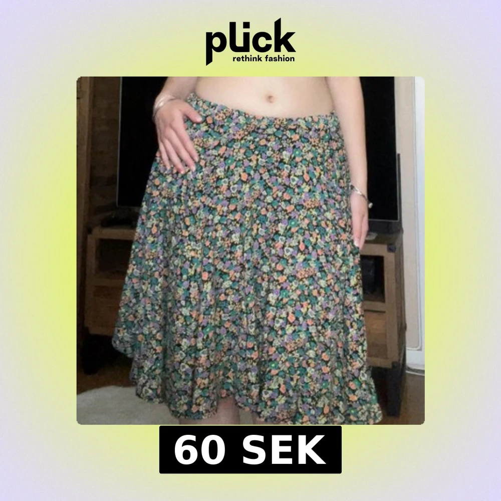 Supersöt blommig kjol från Indiska i storlek M. Kjolen har svart botten med små blommor i lila, turkos, grön, orange och beige. Den är kort och har en flowy, lätt form som ger en skön vibe. Perfekt för dig som gillar färg och mönster!