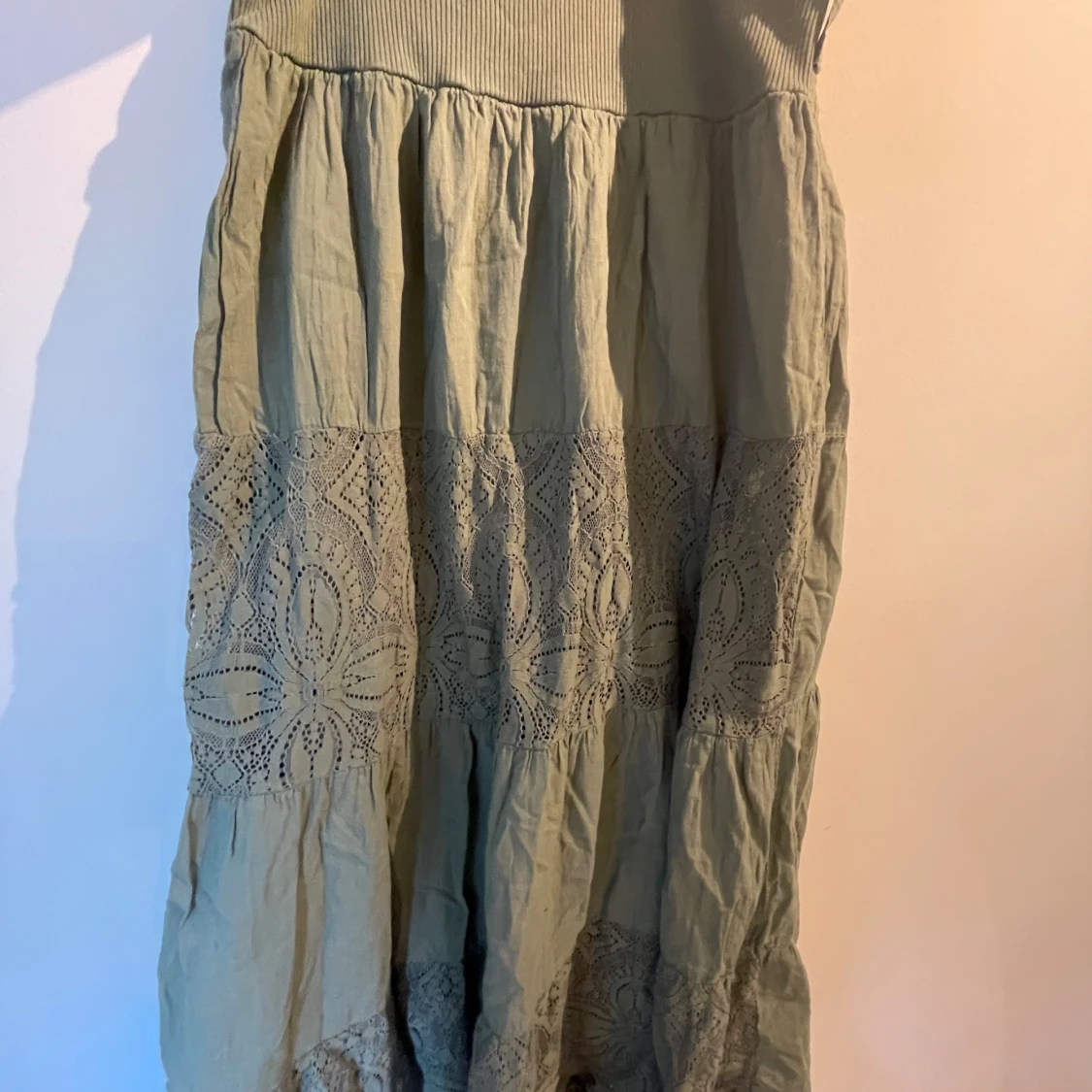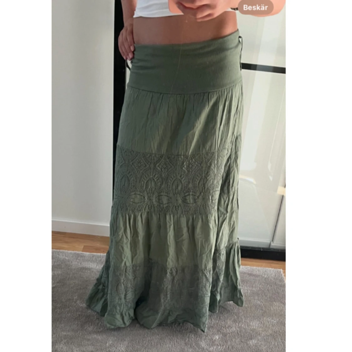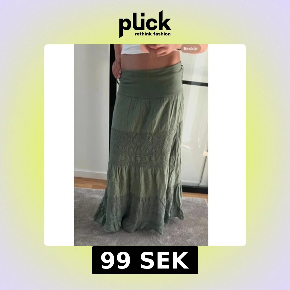 Grön långkjol, som jag köpte på en marknad i Spanien. Det står ingen storlek i men skulle gissa på XS-S. Men eftersom det är ett stretchigt material så passar det nog både större och mindre storlekar. Det har tyvärr blivit ett hål i kjolen, men som är lätt att laga. Om det skulle önskas så kan jag försöka laga det innan det skickas. Skriv om ni har flera funderingar, svarar snabbt!💗💗💗