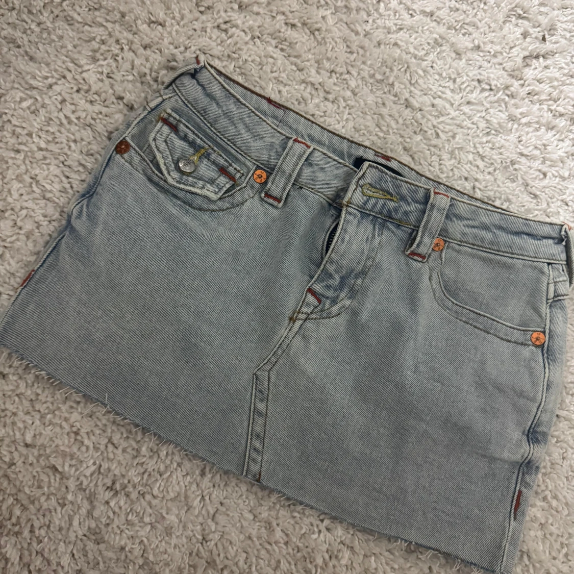 Säljer en ljusblå jeanskjol från true religion i kort modell. Kjolen har klassiska fem fickor, rå kant nedtill och knapp samt dragkedja framtill. Perfekt för dig som gillar en chill och trendig stil. Passar till både t-shirt och hoodie.