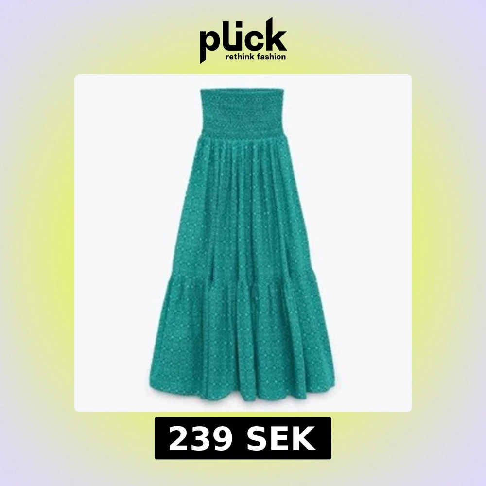 Säljer en turkos långkjol med smockad midja och lätt volang nertill. Kjolen har ett diskret geometriskt mönster och är luftig och flowy, perfekt för varma dagar. Passar dig som gillar boho-vibe och vill ha något bekvämt men ändå snyggt.