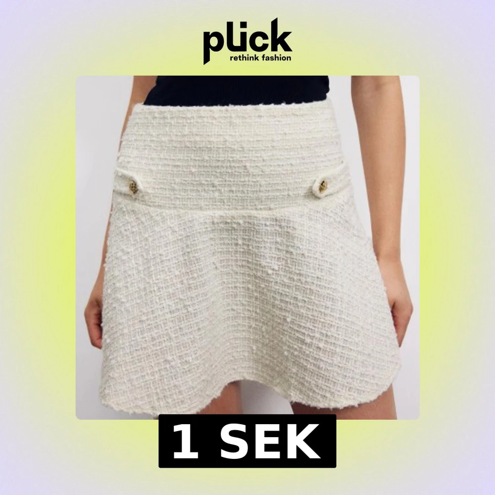Säljer en vit kortkjol i tweed med två dekorativa guldfärgade knappar framtill. Kjolen har en lätt utsvängd form och hög midja, perfekt för en chic och stilren look.
