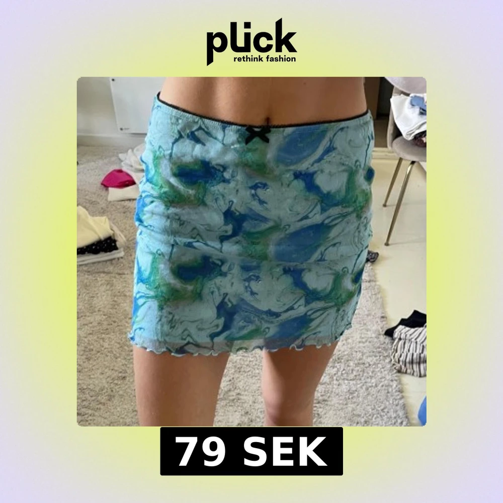 Supersöt kortkjol från Urban Outfitters med blått, grönt och vitt marmorerat mönster. Kjolen har en tight passform, liten svart rosett i midjan och vågig kant nertill. Perfekt för dig som gillar färg och unika prints!