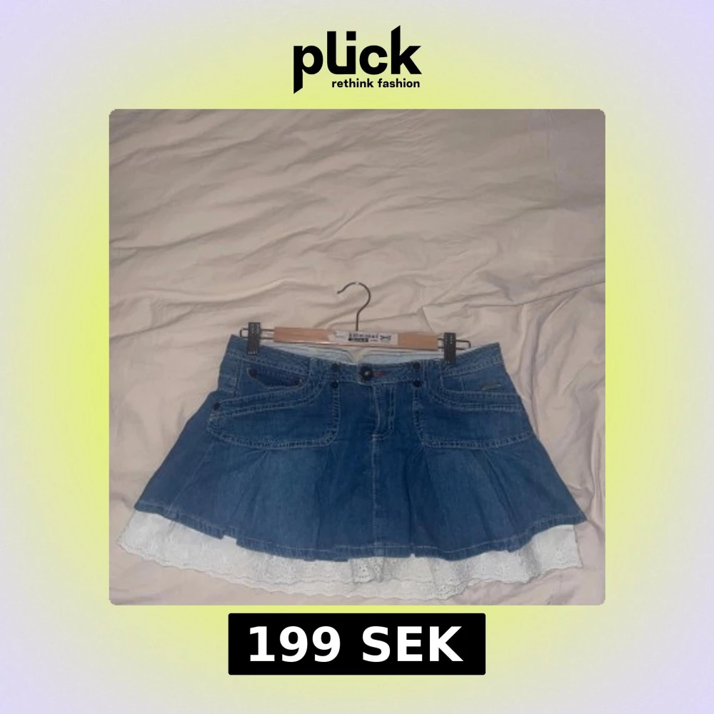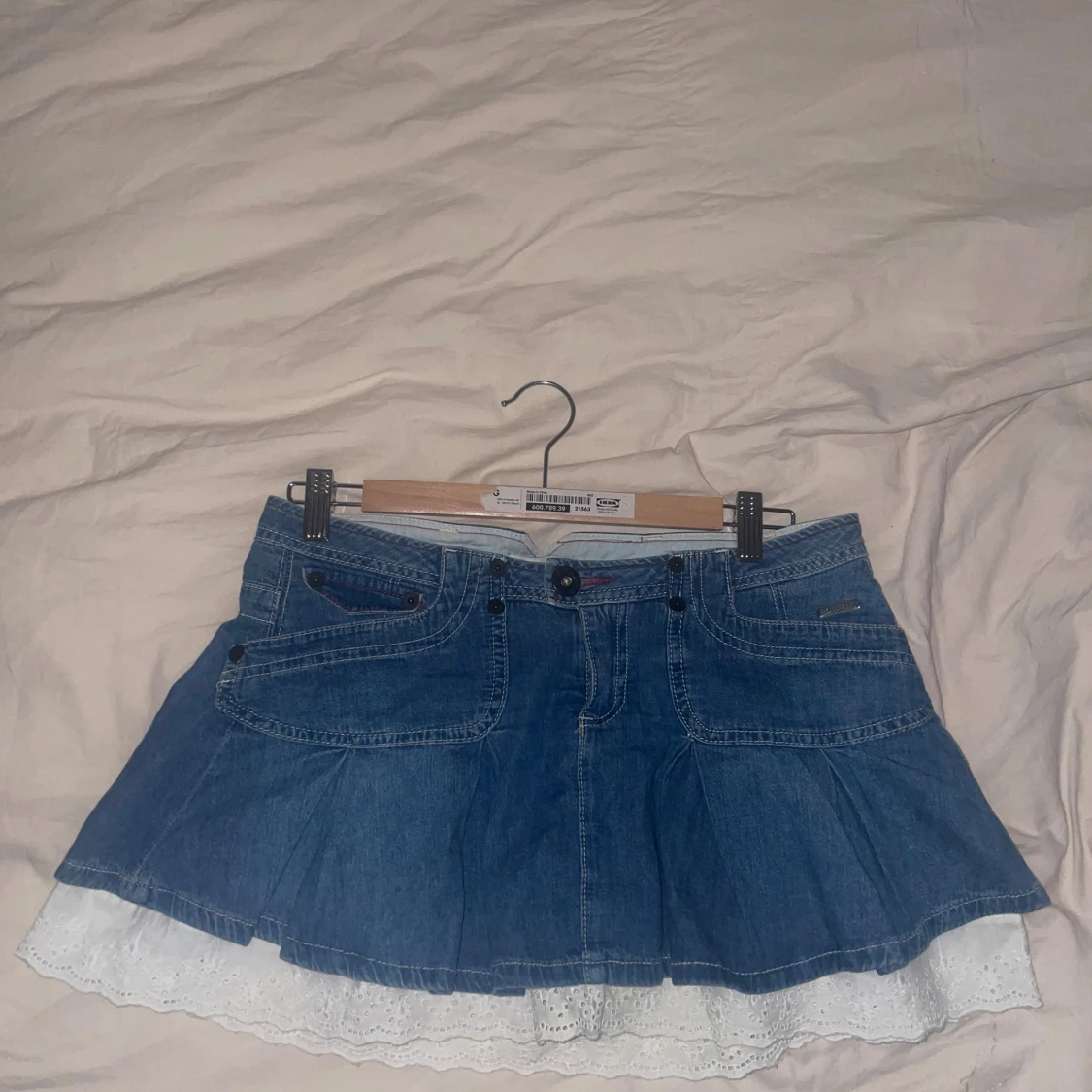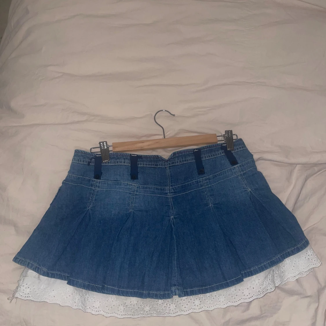 Supersöt blå jeanskjol från BDG Urban Outfitters med volangig vit spetskant nedtill. Kjolen har klassiska jeansfickor, bälteshällor och knappar framtill. Perfekt för dig som gillar denim med en extra touch av romantisk stil.