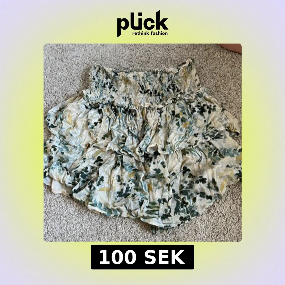 Supersöt kort kjol med blommigt mönster i grönt och gult på ljus botten. Kjolen har bred smock i midjan och flera volanger 💚