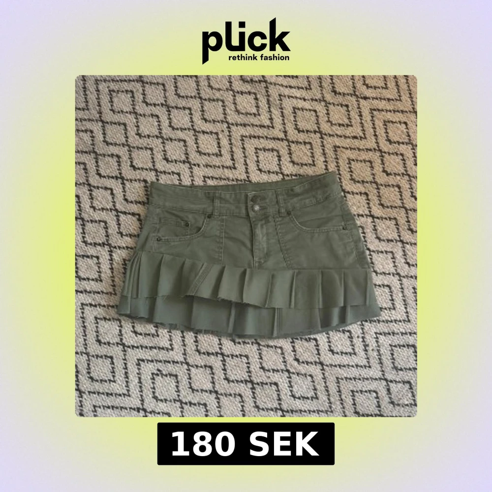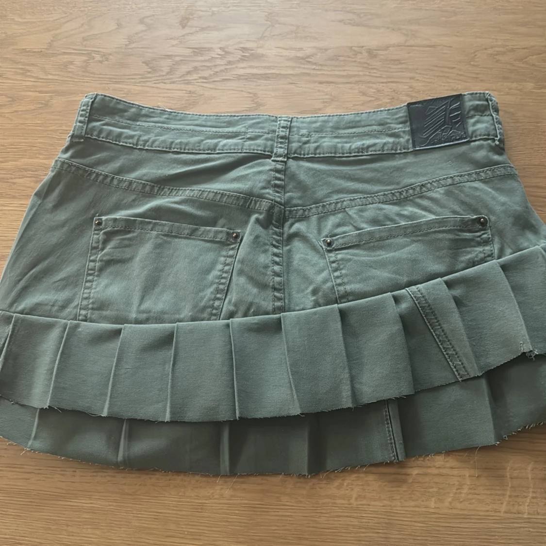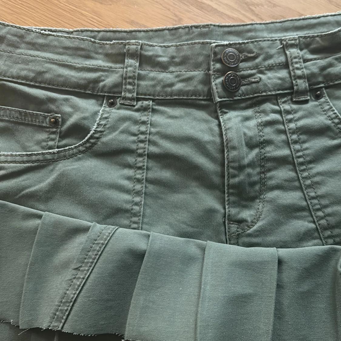 Snygg grön kjol från Gina med volangdetalj, omsydd från jeans. Kjolen är låg i midjan och är tillverkad i ett jeansliknande material. Den har praktiska fickor och knappar framtill för en cool look.