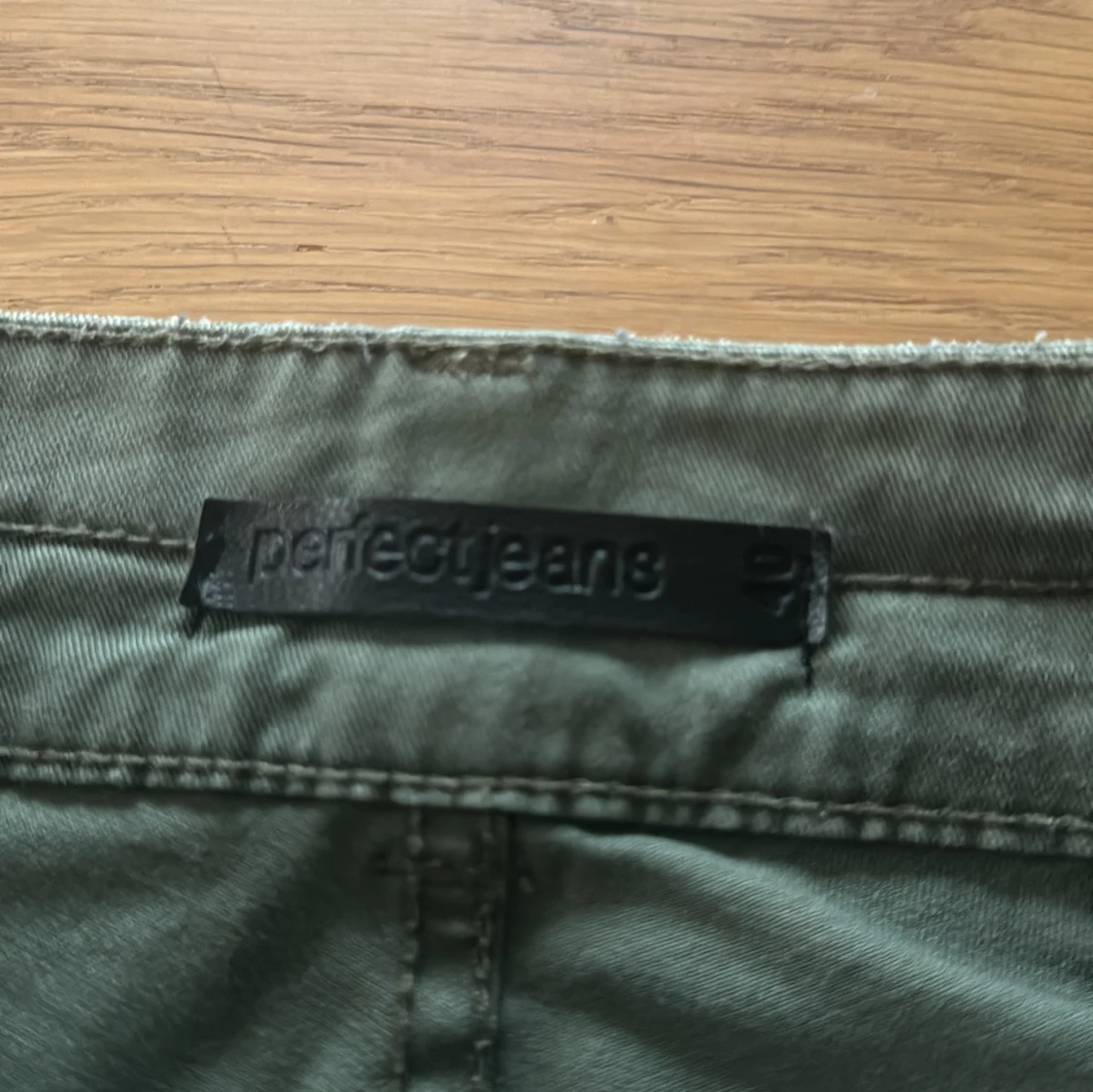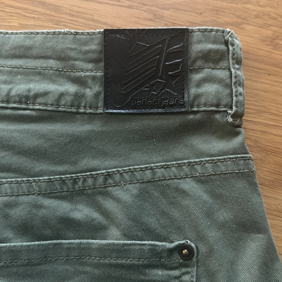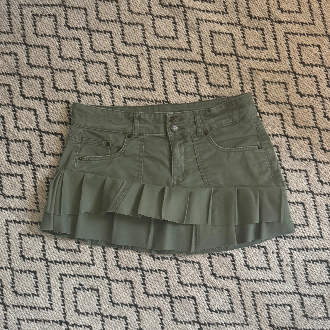 Snygg grön kjol från Gina med volangdetalj, omsydd från jeans. Kjolen är låg i midjan och är tillverkad i ett jeansliknande material. Den har praktiska fickor och knappar framtill för en cool look.