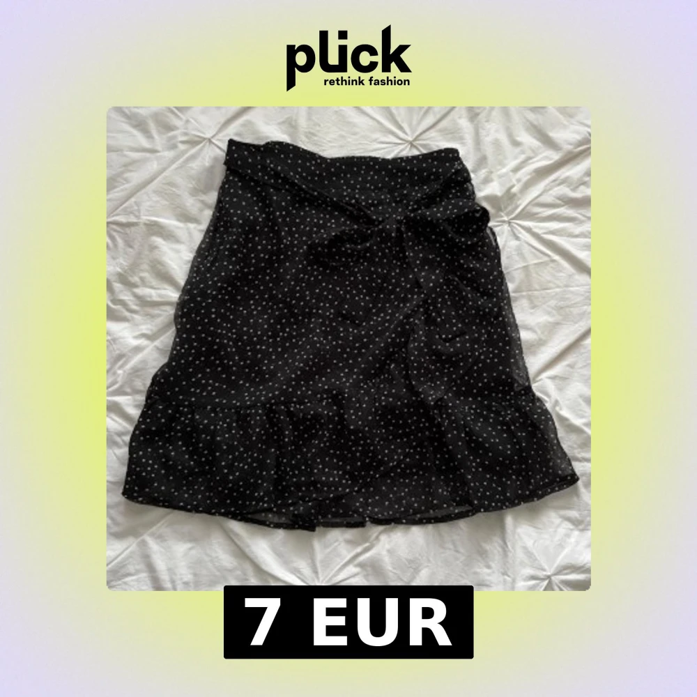 Snygg svart kjol med vita prickar och volangdetalj. Kjolen har ett knytband i midjan för en justerbar passform. Perfekt för en stilren look.