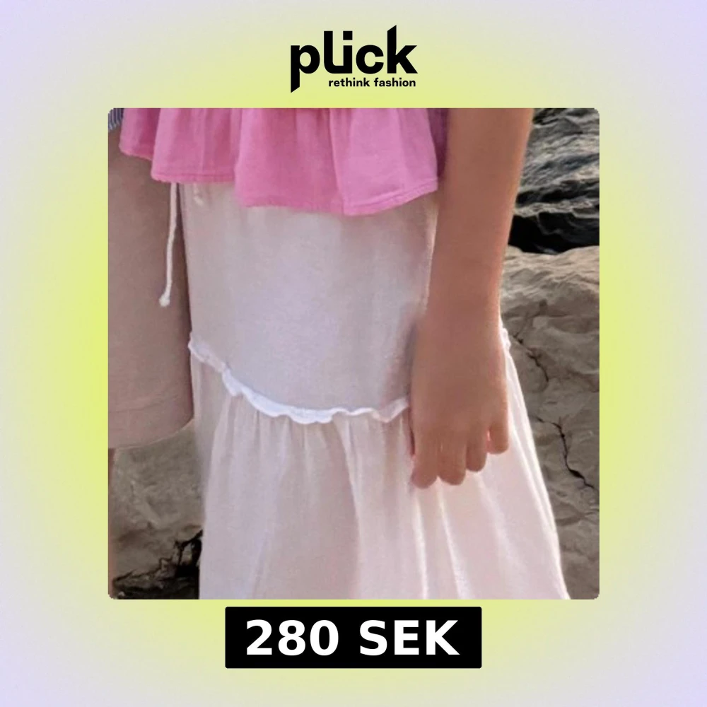 Superfin vit långkjol med volangdetaljer. Kjolen har en luftig och flowy känsla, perfekt för varma dagar. Man knyter den framtill så den kan passa både S och M.
