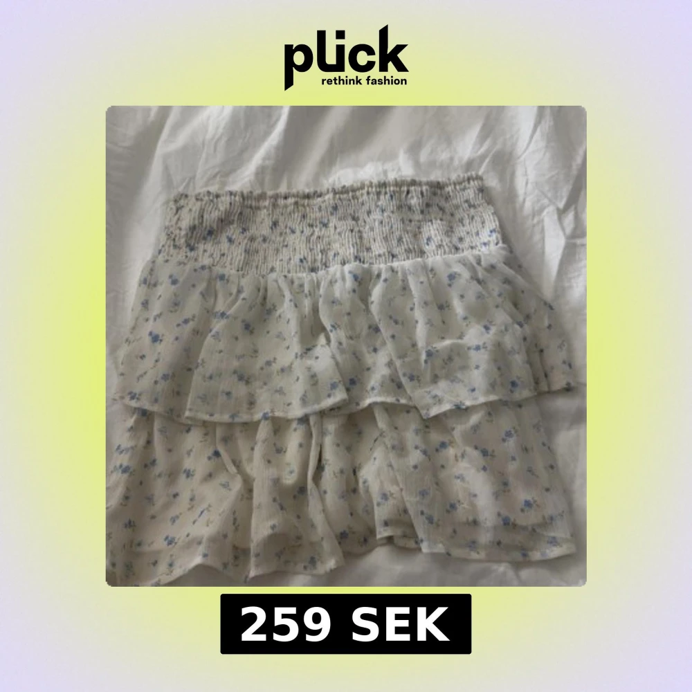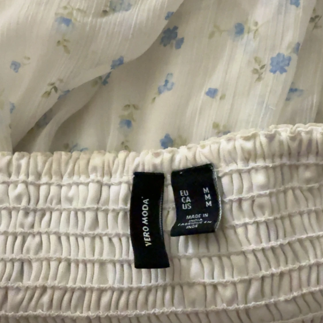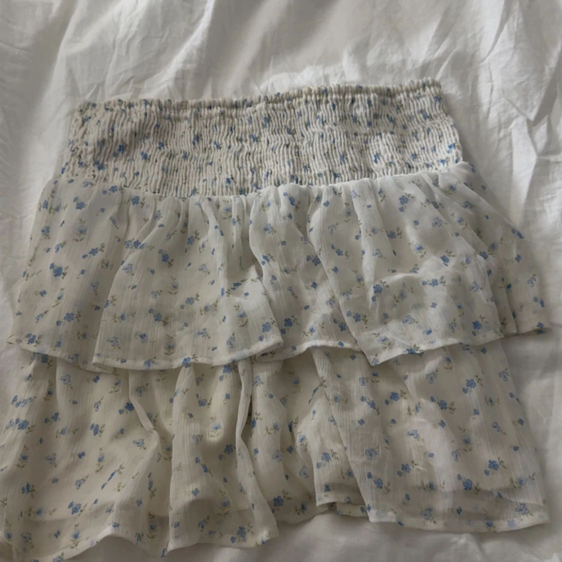 Supersöt kort kjol från Vero Moda med volanger och små blå blommor på vit botten. Kjolen har smock i midjan för en bekväm passform och är perfekt för varma dagar. Lätt och luftig känsla, passar perfekt till sneakers eller sandaler.