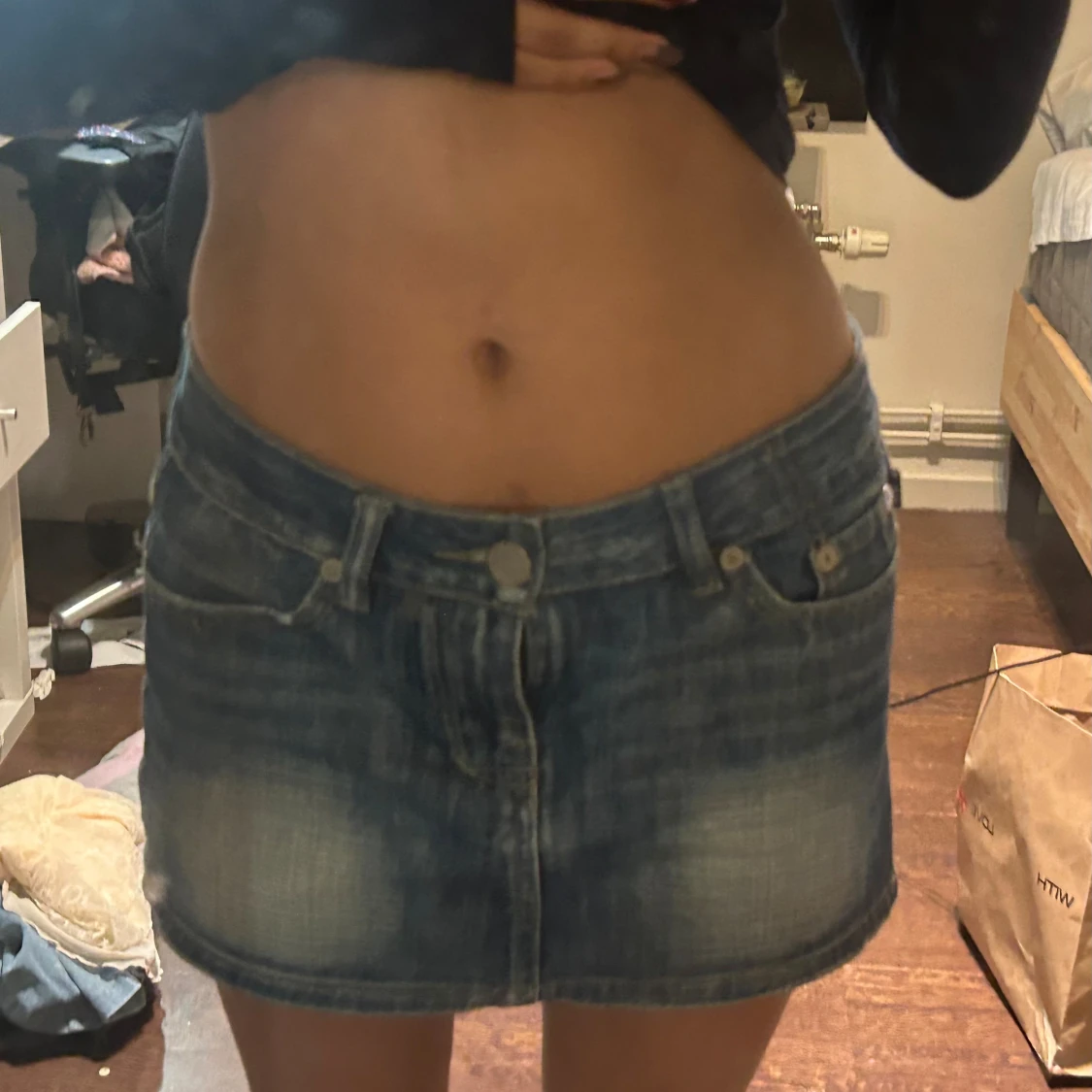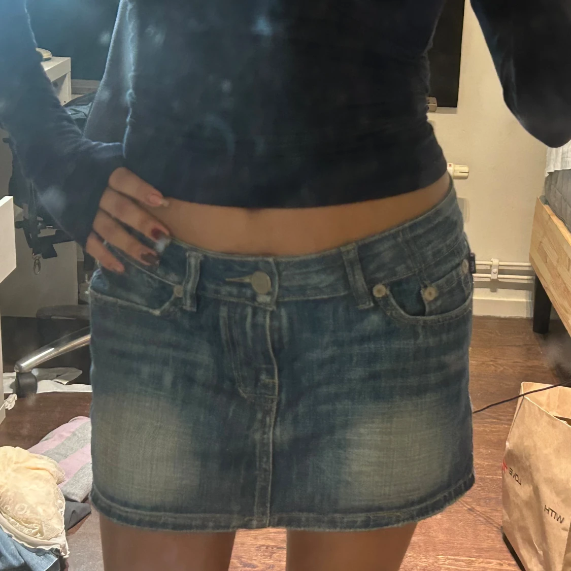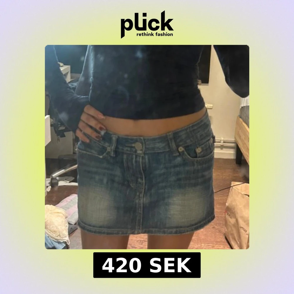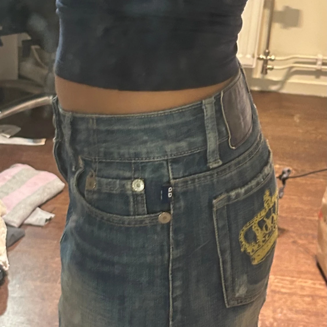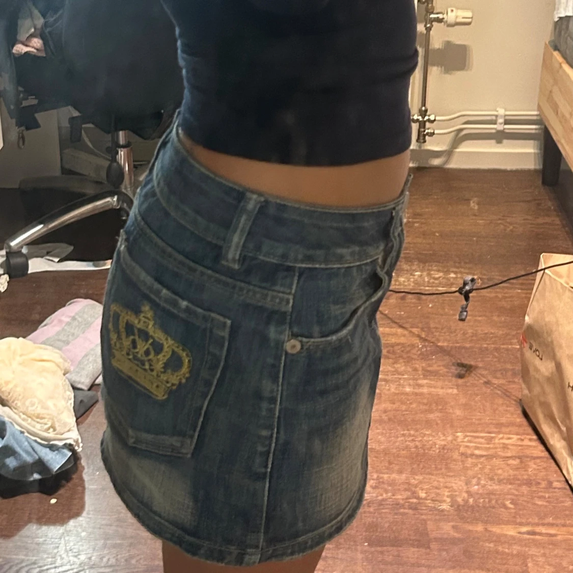 Säljer en blå jeanskjol från Victoria Beckham med klassisk femficksdesign och snygg gul broderad krona på bakfickan. Kjolen är kort och har en lätt tvättad look med slitningar för en cool vibe. Perfekt till sneakers eller boots.