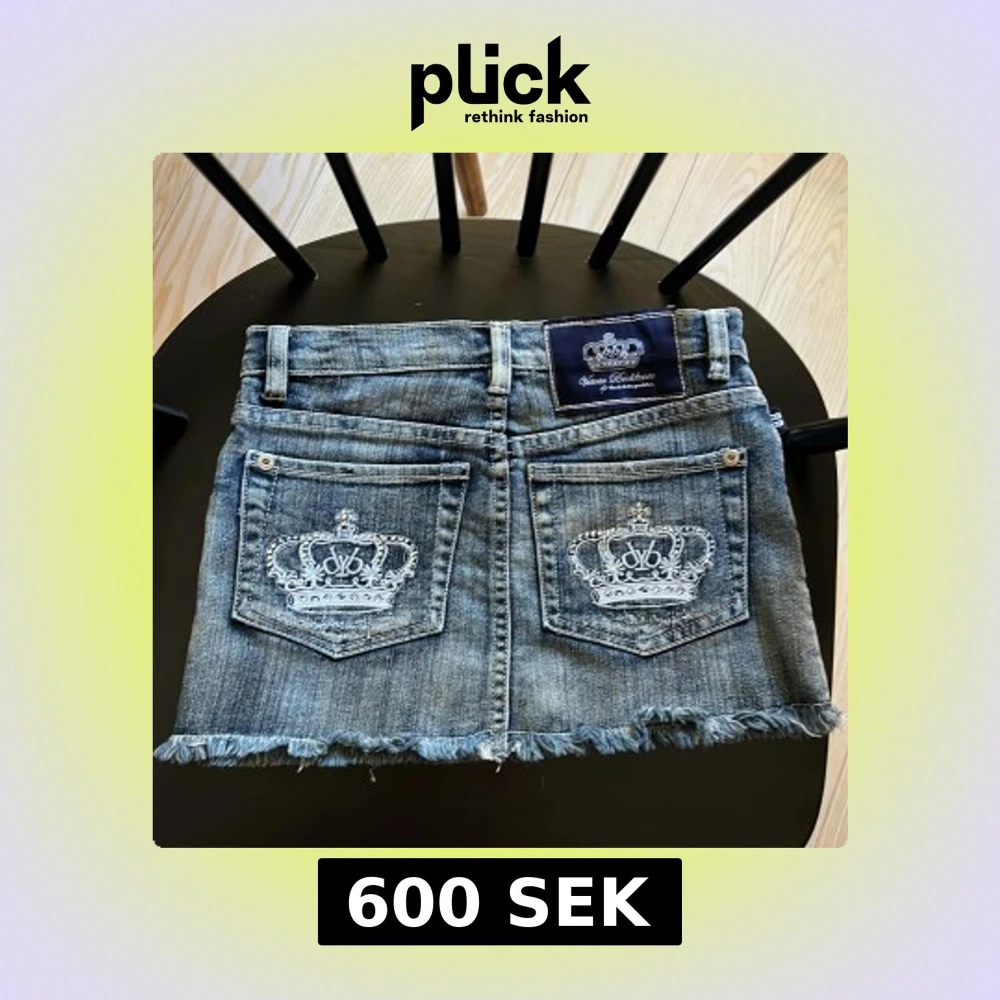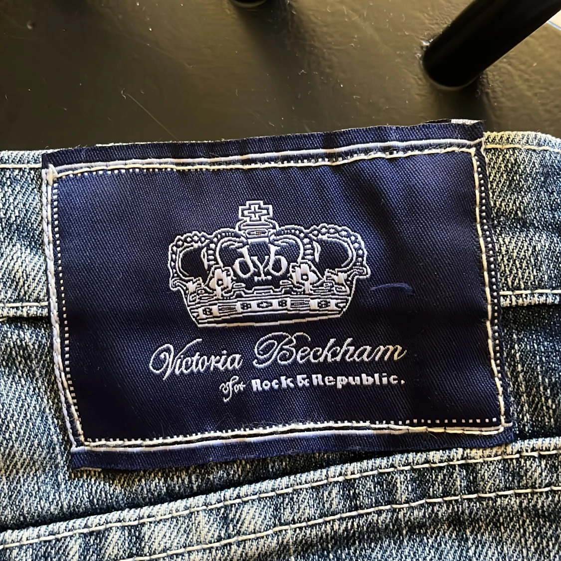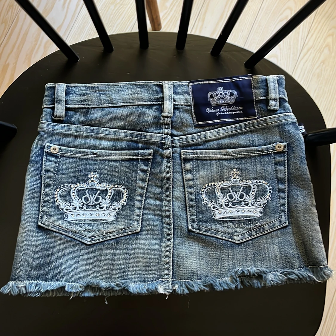 Jättesnygg jeanskjol i blå denim från Victoria Beckham for Rock & Republic. Står ingen storlek men skulle säga Xs eller s (mer åt den mindre sidan). Kjolen har fransad nederkant och broderade fickor. Tyvär är dragkedjan lite trasig, men det găr säkert att fixa. Det finns också knapp som kan användas istället för kedjan, så det finns inga problem men själva användningen. Fråga gärna för fler bilder och mått!