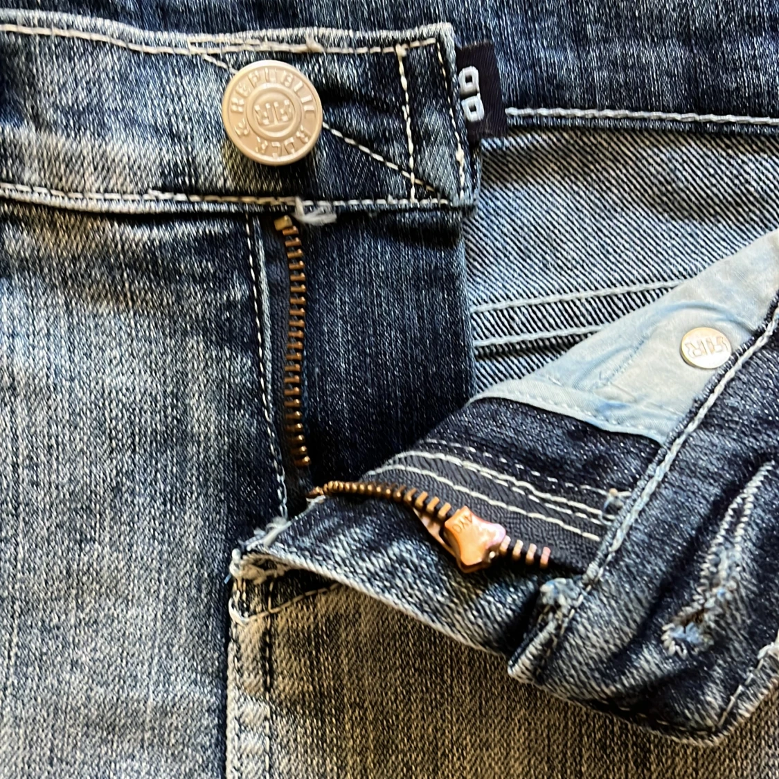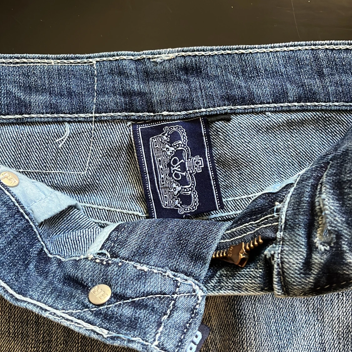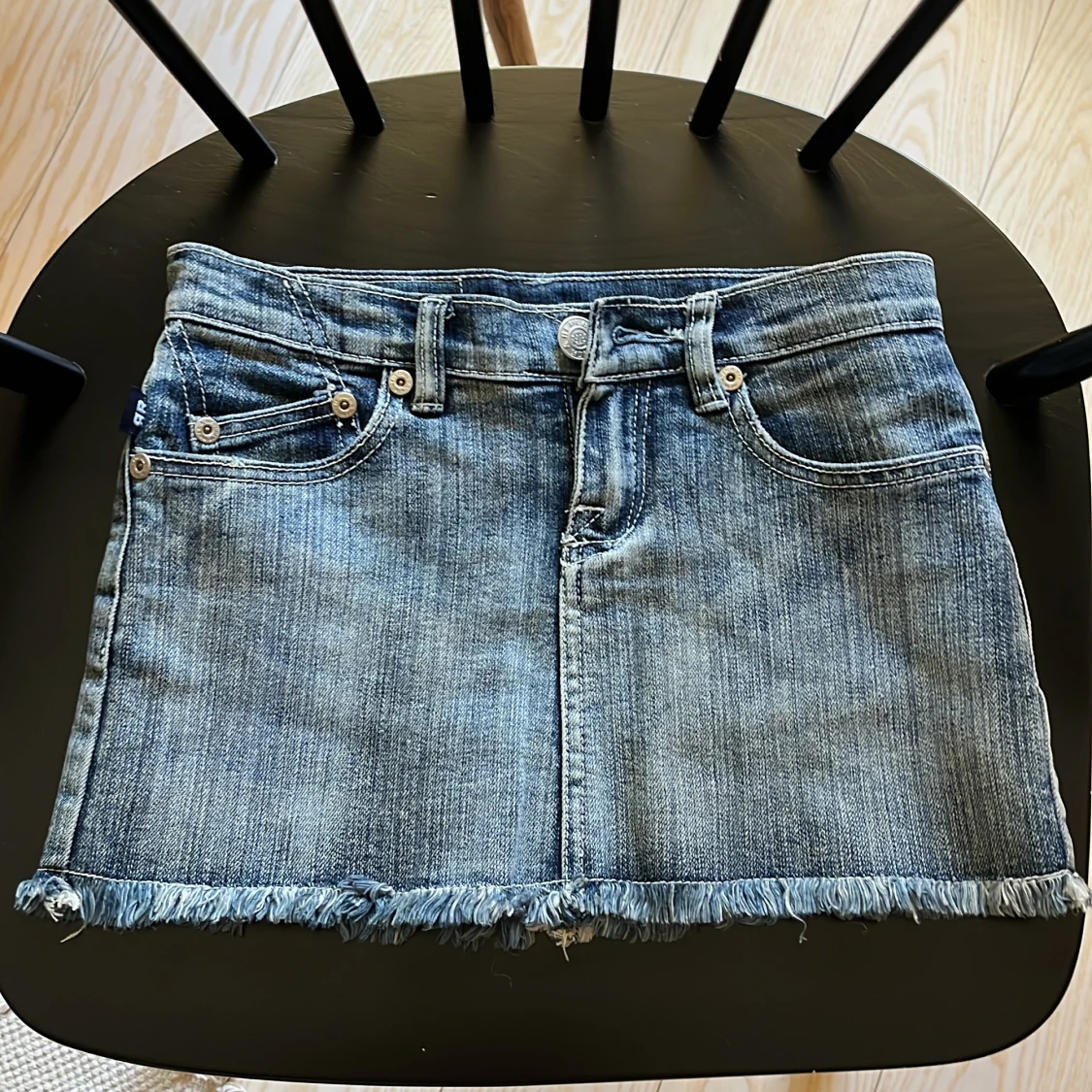 Jättesnygg jeanskjol i blå denim från Victoria Beckham for Rock & Republic. Står ingen storlek men skulle säga Xs eller s (mer åt den mindre sidan). Kjolen har fransad nederkant och broderade fickor. Tyvär är dragkedjan lite trasig, men det găr säkert att fixa. Det finns också knapp som kan användas istället för kedjan, så det finns inga problem men själva användningen. Fråga gärna för fler bilder och mått!