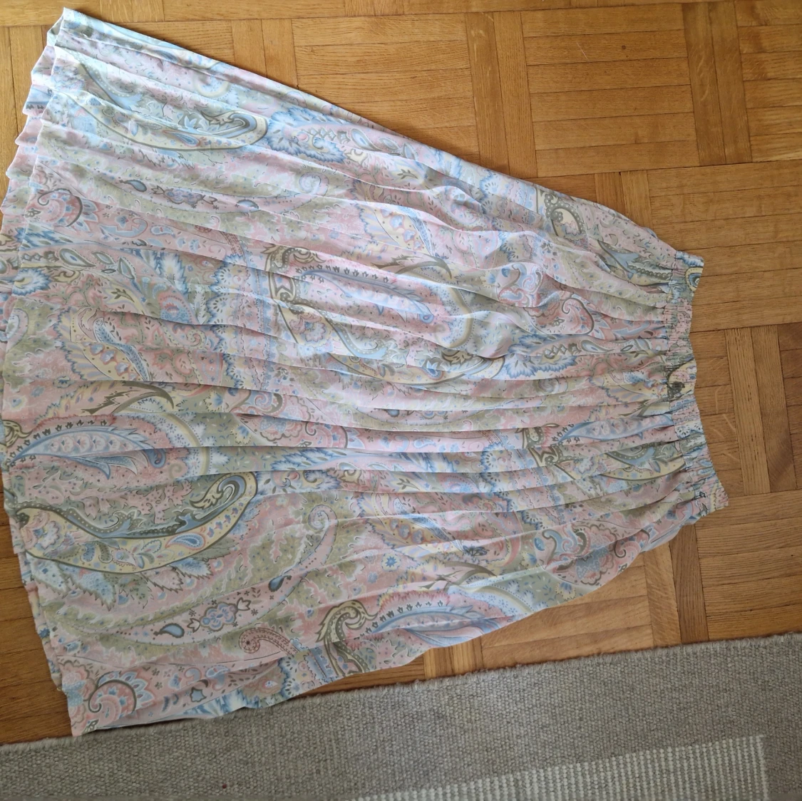 Flowy långkjol från Alfred Dunner i mjuk polyester med pastelliga toner av rosa, blått, grönt och beige. Kjolen har ett paisleyinspirerat mönster och resår i midjan för en bekväm passform. Perfekt för dig som gillar vintagevibbar och boho-stil.