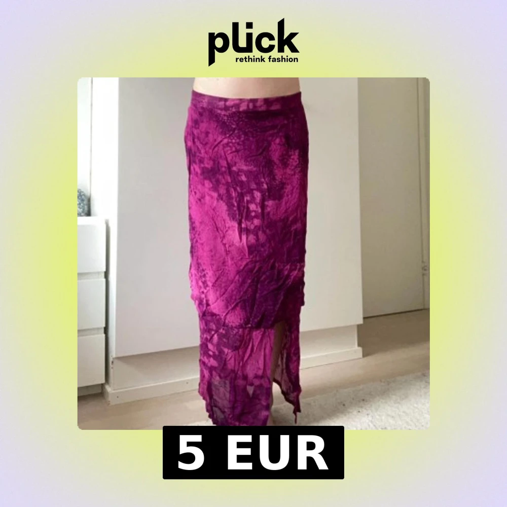 Säljer en långkjol i starkt lila och rosa toner med abstrakt mönster. Kjolen har en lätt transparent känsla, oregelbunden nederkant och slits framtill. Materialet är tunt och flowy, perfekt för dig som vill sticka ut med färg och cool struktur.