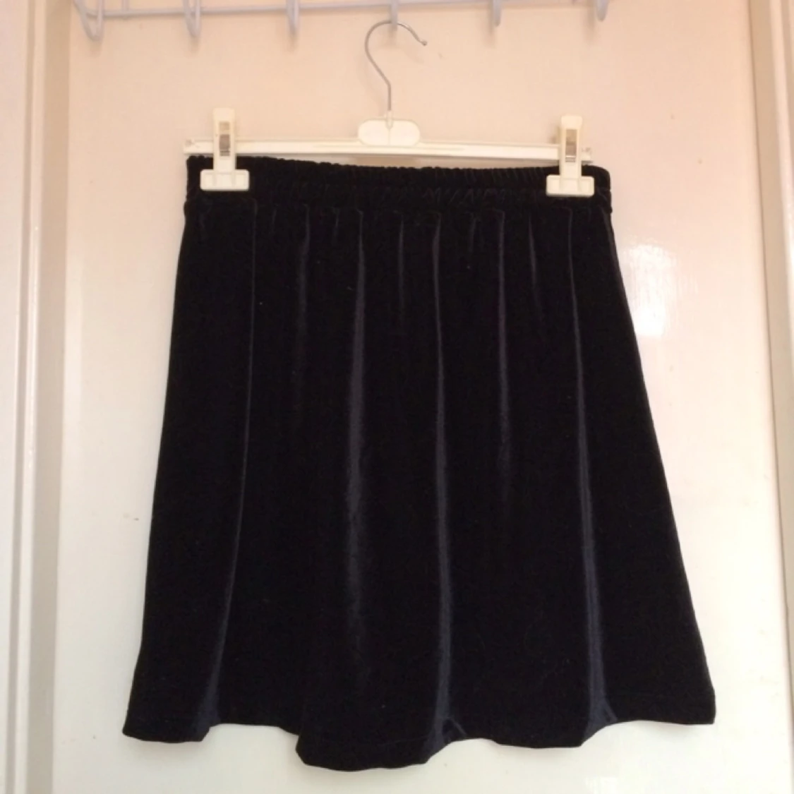 Svart sammetskjol, utsvängd med resårmidja, från Beyond Retro. Sparsamt använd, superfint skick. Storlek M, men jag tror att den kan passa alla från S - större M/liten L. Pris diskuterbart, kan mötas runt Malmö eller skicka på posten.