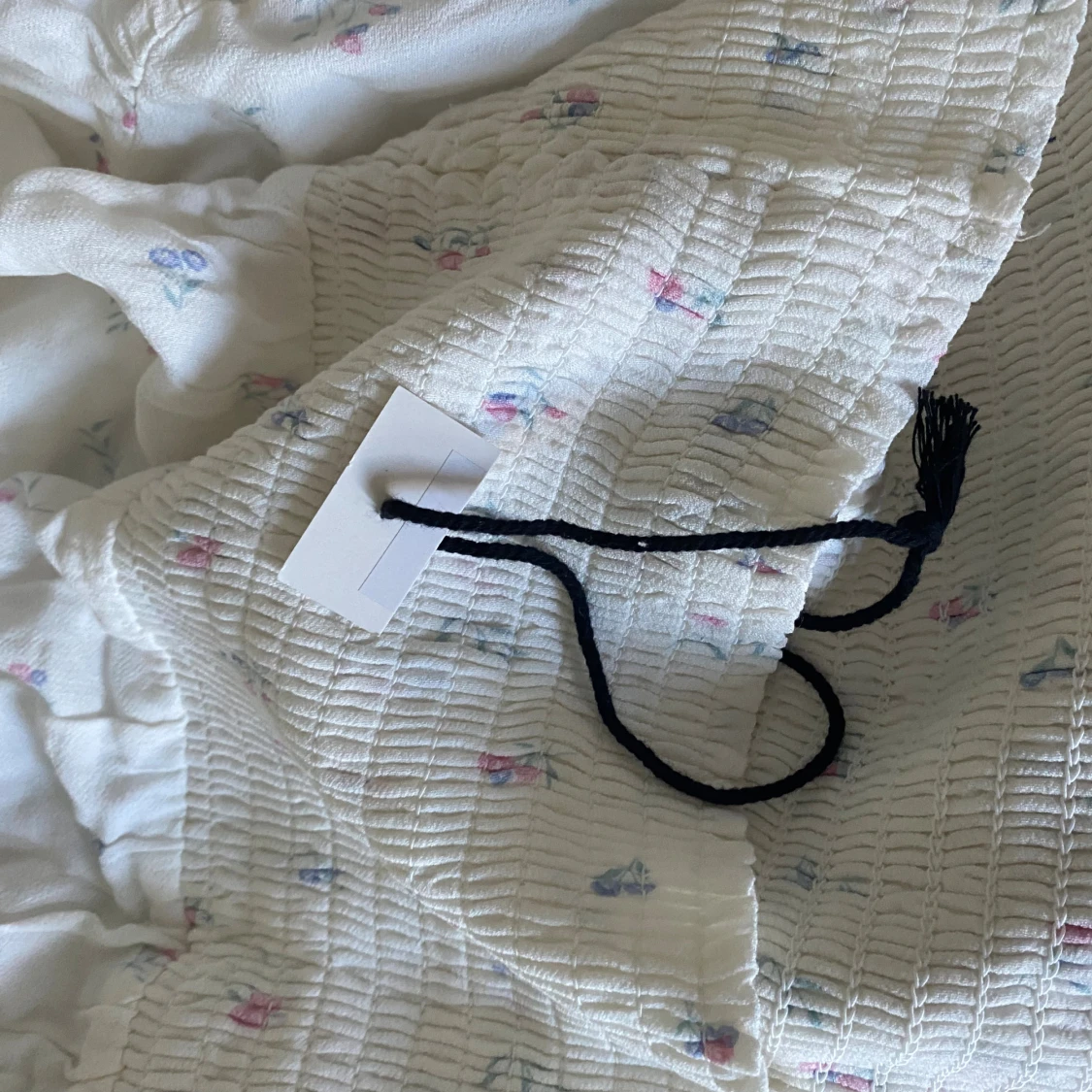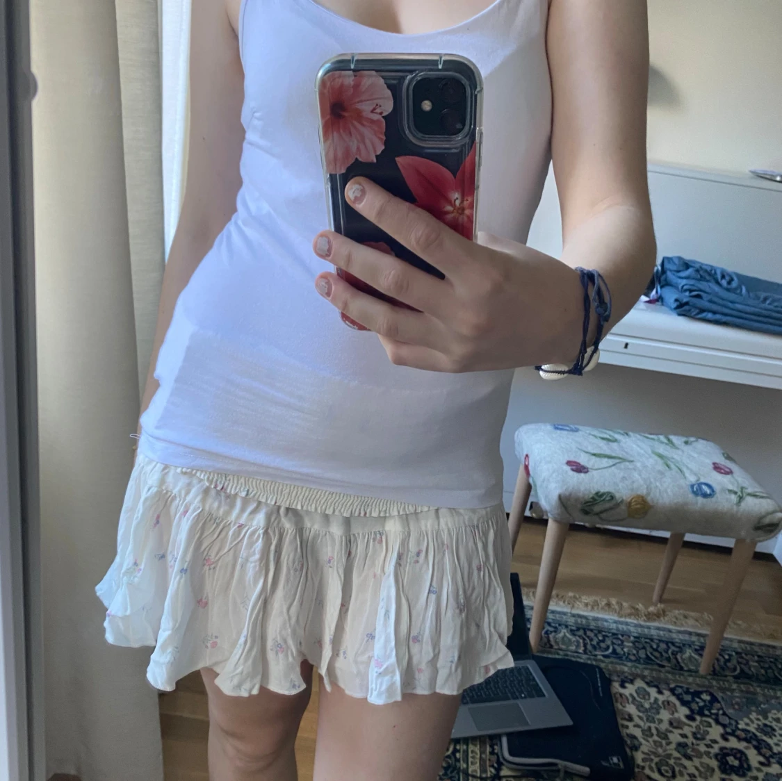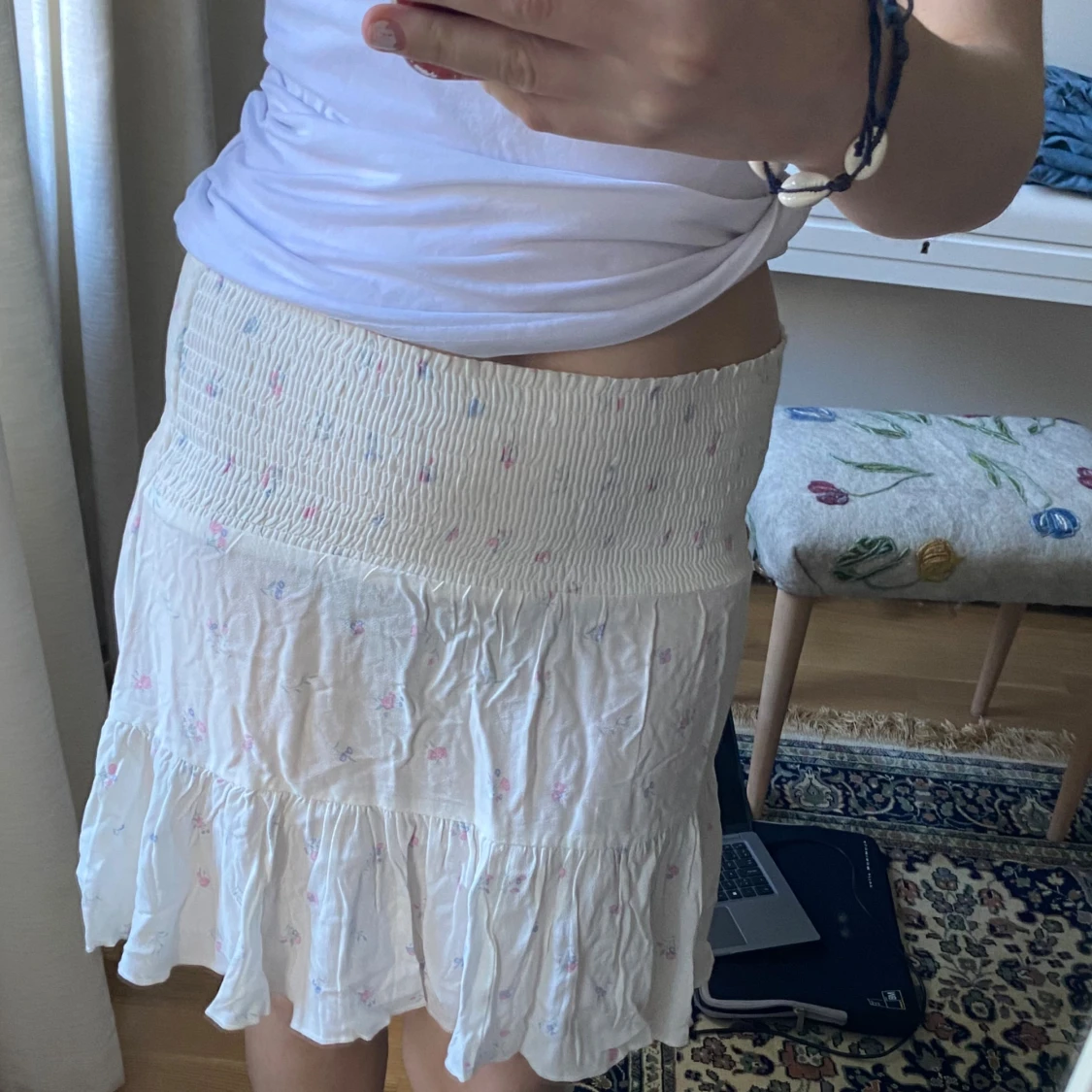 Supersöt vit kortkjol med små blommor i pastellfärger och bred smock i midjan. Kjolen har volang nertill som ger en flowy känsla och är gjord i ett lätt och luftigt material, perfekt för varma dagar. Högmidjad men går att vika mer så att den blir kortare.💕 lappen är kvar men klippt för att det var en present. 💕💕