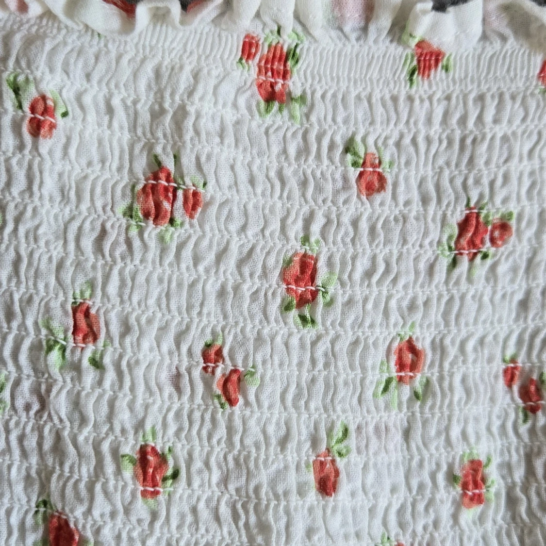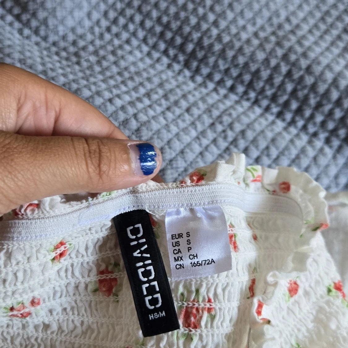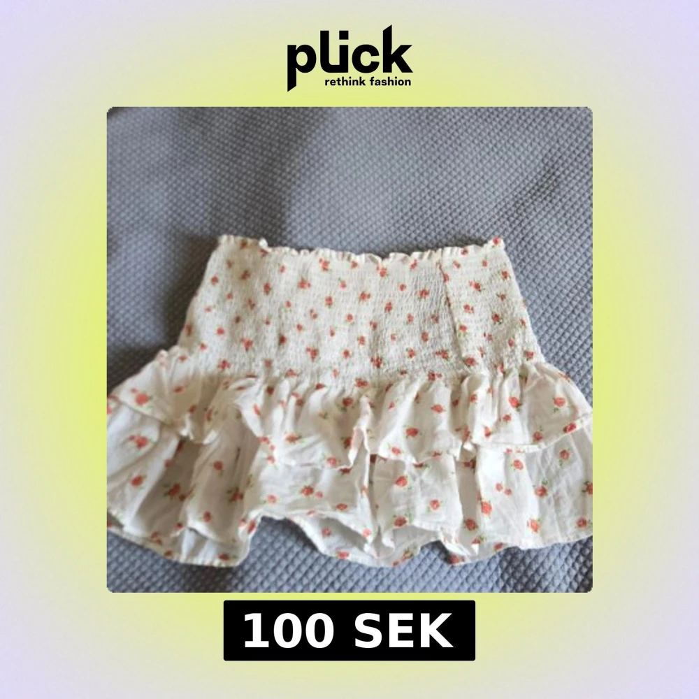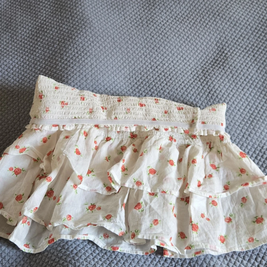Ny utan prislapp!! Supersöt kort kjol från H&M Divided i vit med små röda blommor och gröna blad. Kjolen har smock upptill och flera lager volanger som ger en flowy och lekfull look. Passar mellan stl s-l då den är stretchig! Den går att ha highwaist och low waist! De går att vika ner kartan för att få ännu mer low waist! Skriv om du har några frågor eller om du är intresserad! Pris kan diskuteras! 🩷