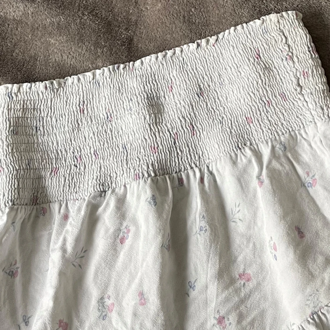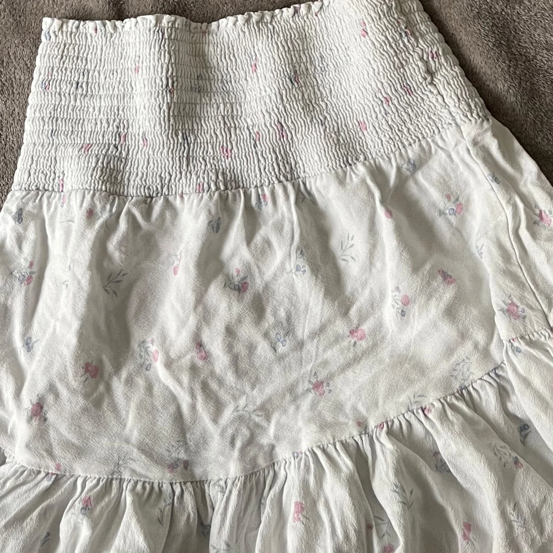 Supersöt vit kjol med små blommor i rosa och blått. Kjolen har bred smock i midjan och volang nertill för en extra flowy känsla. Perfekt för varma dagar och enkel att matcha med en enkel topp. Kan även användas som en topp!