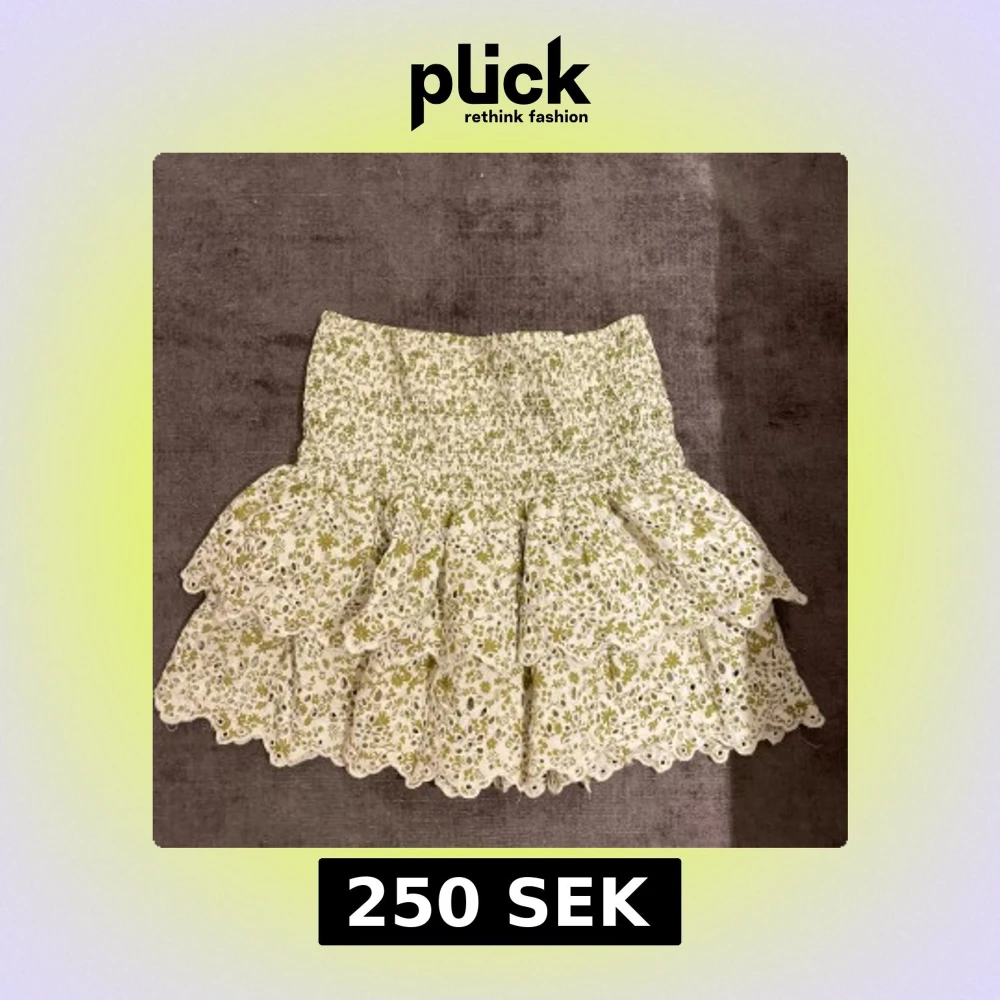 Supersöt kort kjol med volanger och broderade blommor i grönt på vit botten. Perfekt för sommaren.