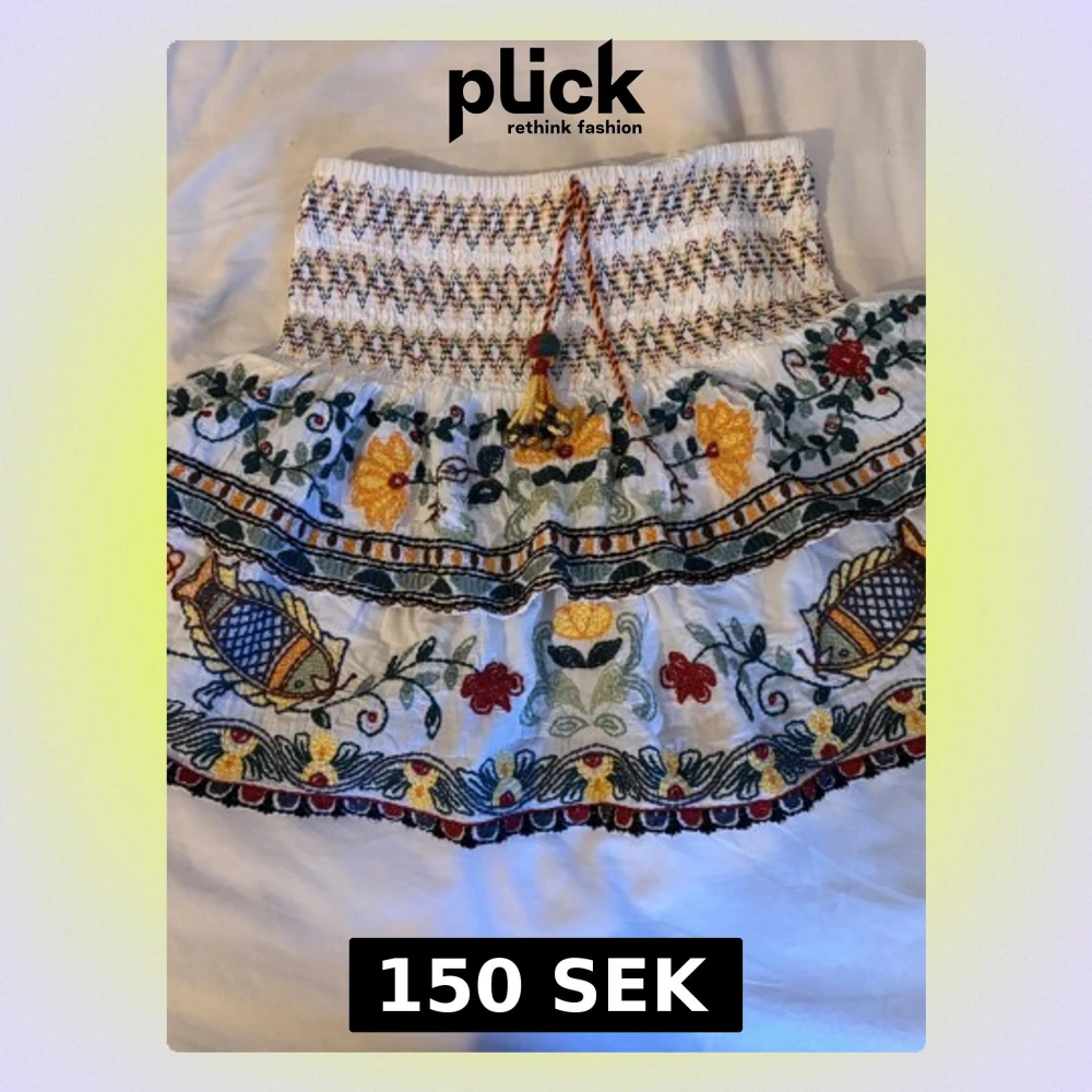 Supersöt vit kortkjol från Zara med färgglad brodyr i blommönster och fiskar. Kjolen har smock i midjan, dekorativ knytning med tofsar och pärlor samt volangkant. Perfekt för dig som gillar boho-vibbar och unika detaljer.lägg märke till att ena snöret saknar en tofs med pärlor!!