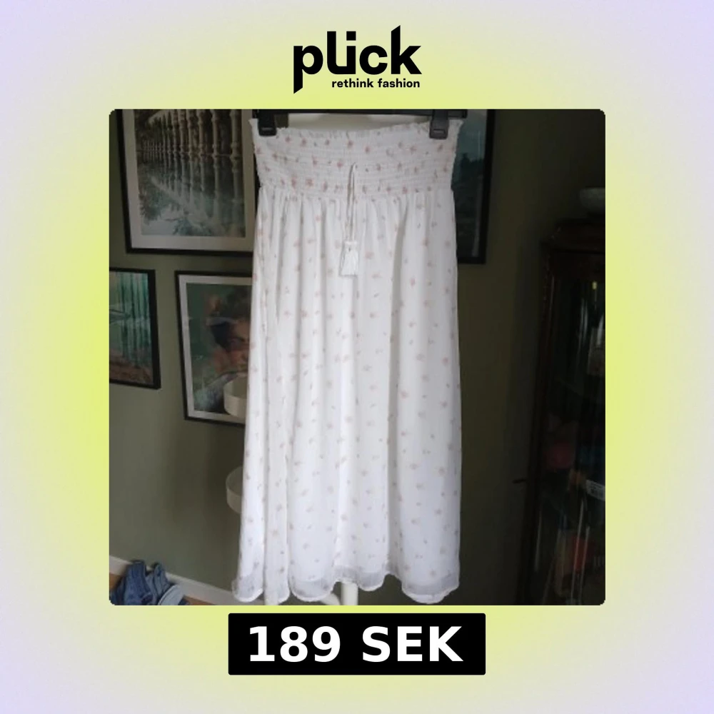 Superfin vit långkjol med små rosa blommor och smockad midja. Kjolen har knytband med tofsar framtill och ett luftigt, flowy tyg som känns perfekt för varma dagar. Söt och romantisk stil som passar dig som gillar en bohemisk vibe. Köpt för 359 kr.