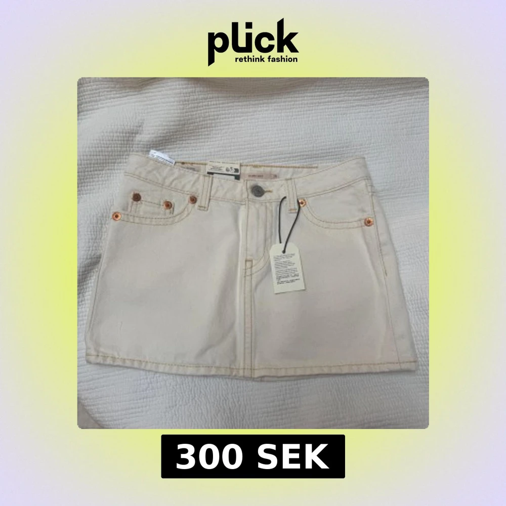 Snygg vit jeanskjol från Levi's med klassiska fem fickor, synliga sömmar och detaljer i kopparfärg. Storlek 25, aldrig använd med tagg på.