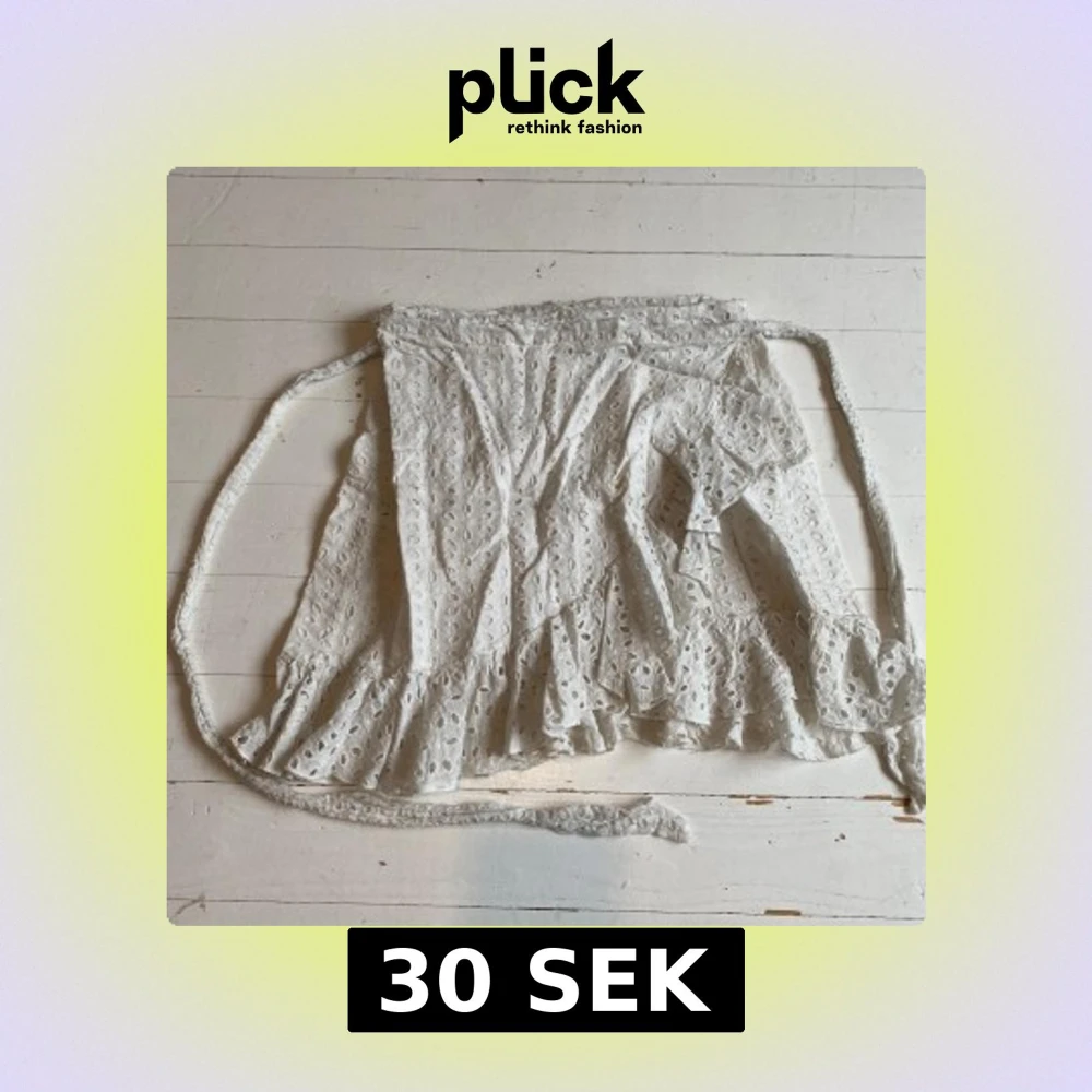 Charmig vit kjol med broderade hålmönster och volangdetaljer. Kjolen har knytband i midjan för justerbar passform. Perfekt för en somrig look! Passar både M och L, kanske S. Finns två små fläckar på framsidan(bild 3,4) syns dock inte när man använder den. Pris kan diskuteras vid snabb affär!