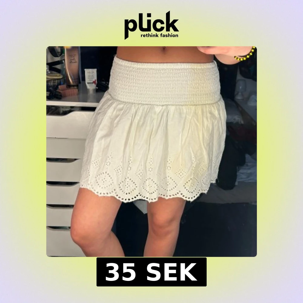 Supersöt vit kortkjol med bred smock i midjan och broderade hålmönster längs fållen. Kjolen är luftig och har en lätt volangig kant, perfekt för varma dagar. Tyvärr så råkade jag spilla på den, så i vissa ljus (som detta) så syns de lite. Den är från Gina Young och i stl 146/152 men passar mig som har xs-s🥰.