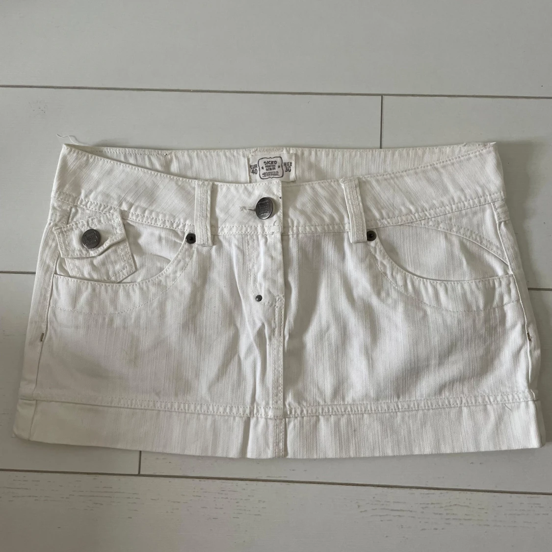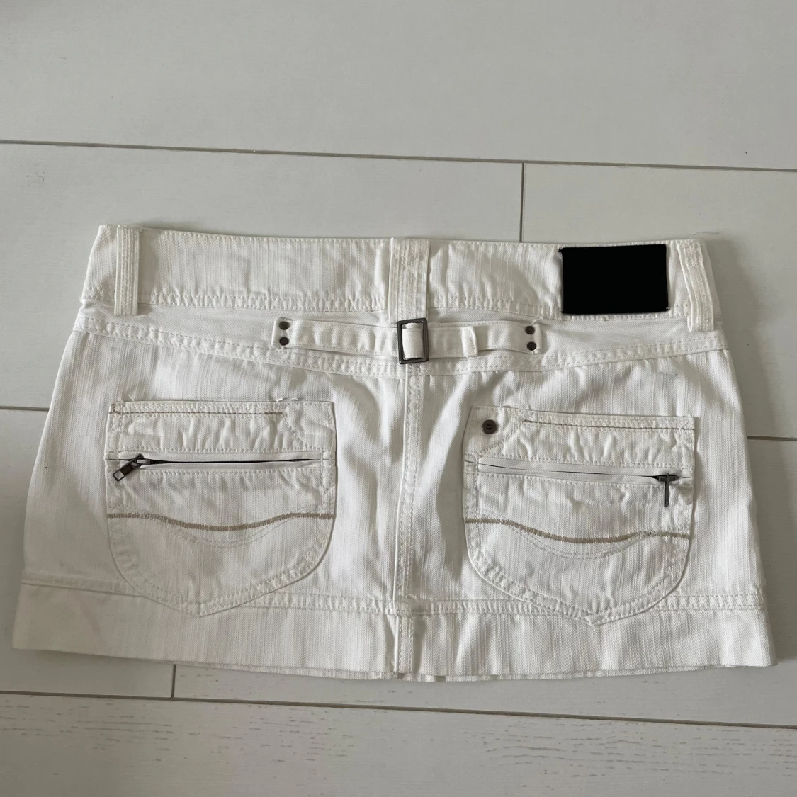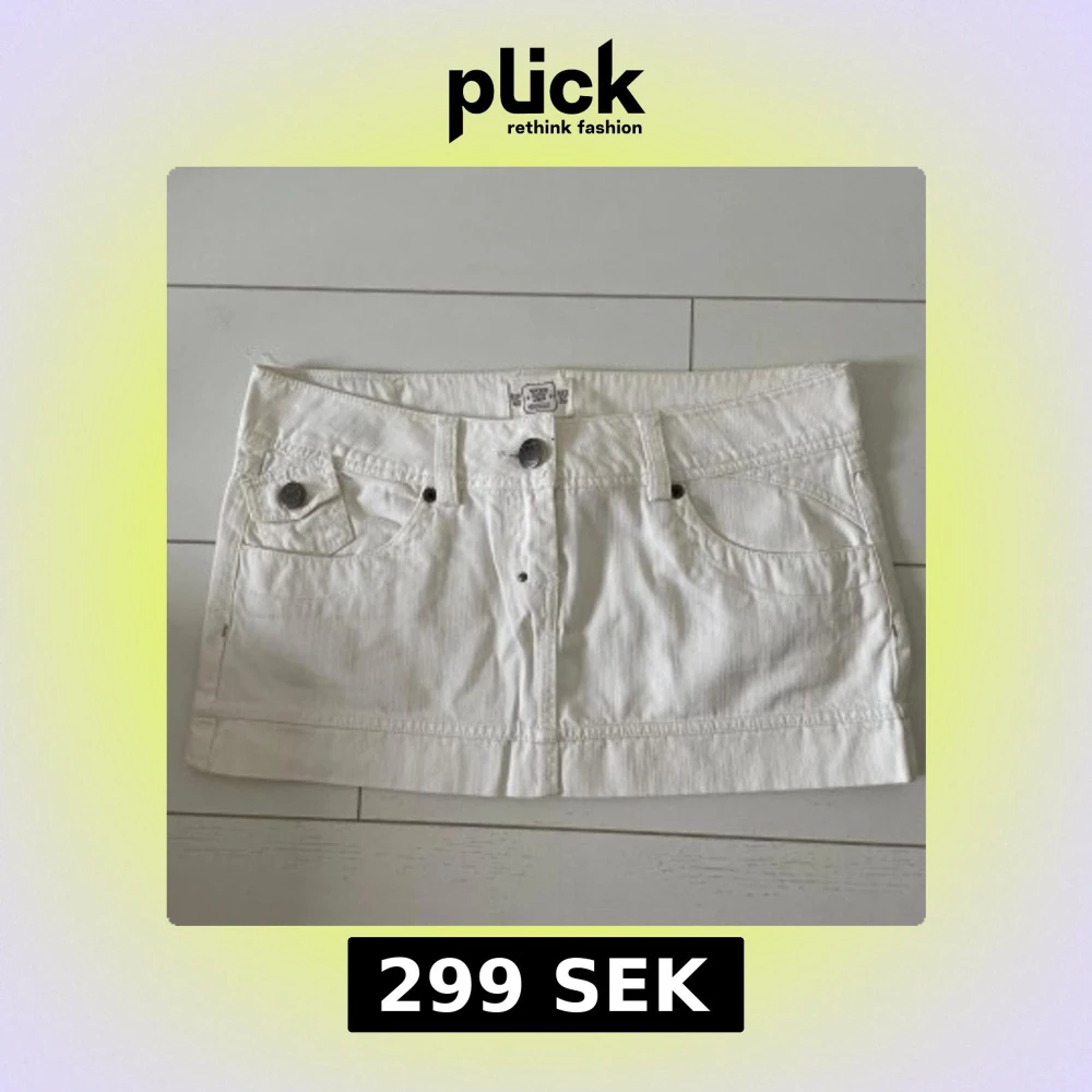 Snygg vit kortkjol med klassisk jeansdesign. Kjolen har fram- och bakfickor med dragkedjor och en dekorativ bältesdetalj baktill. Perfekt för en stilren look.