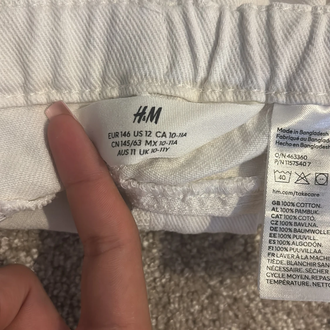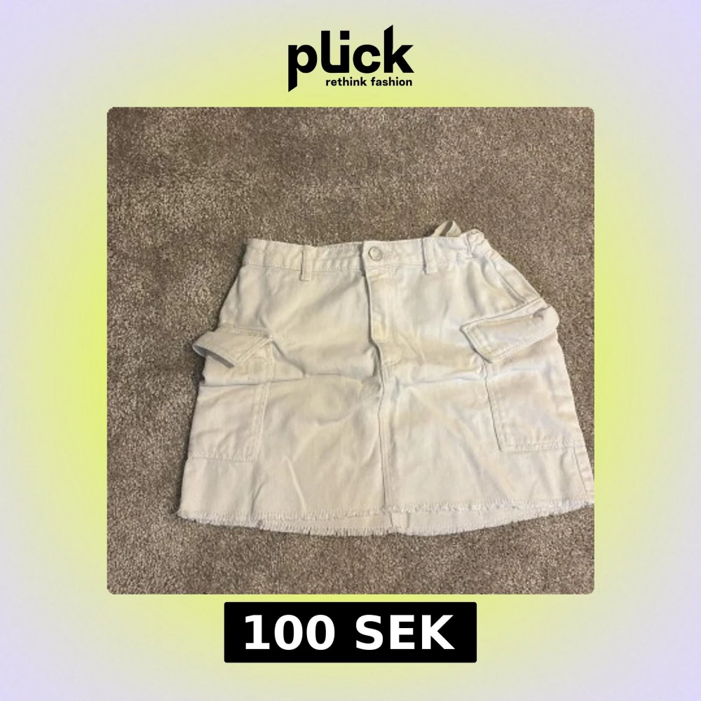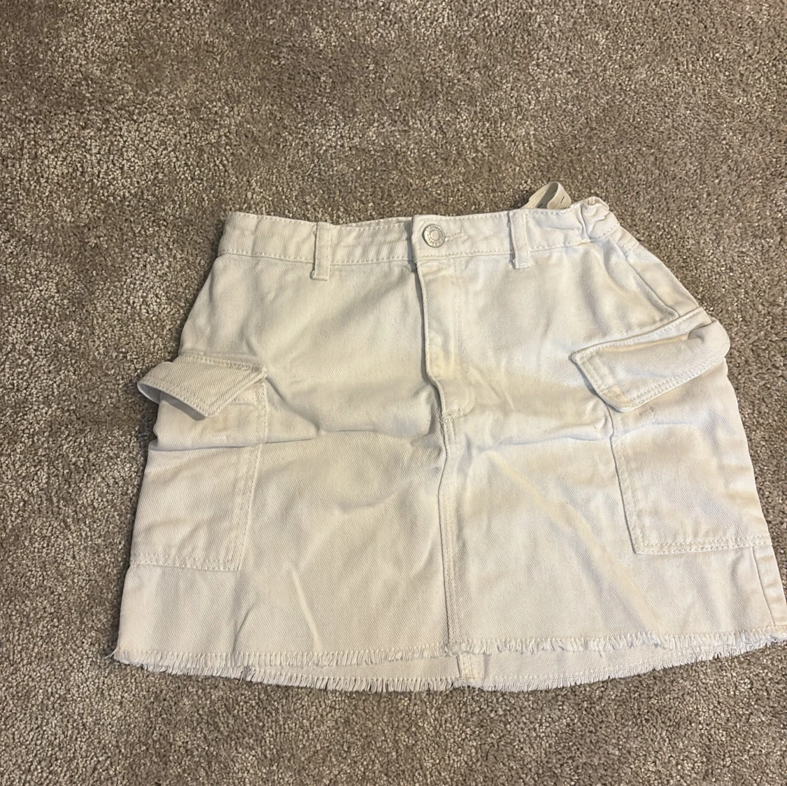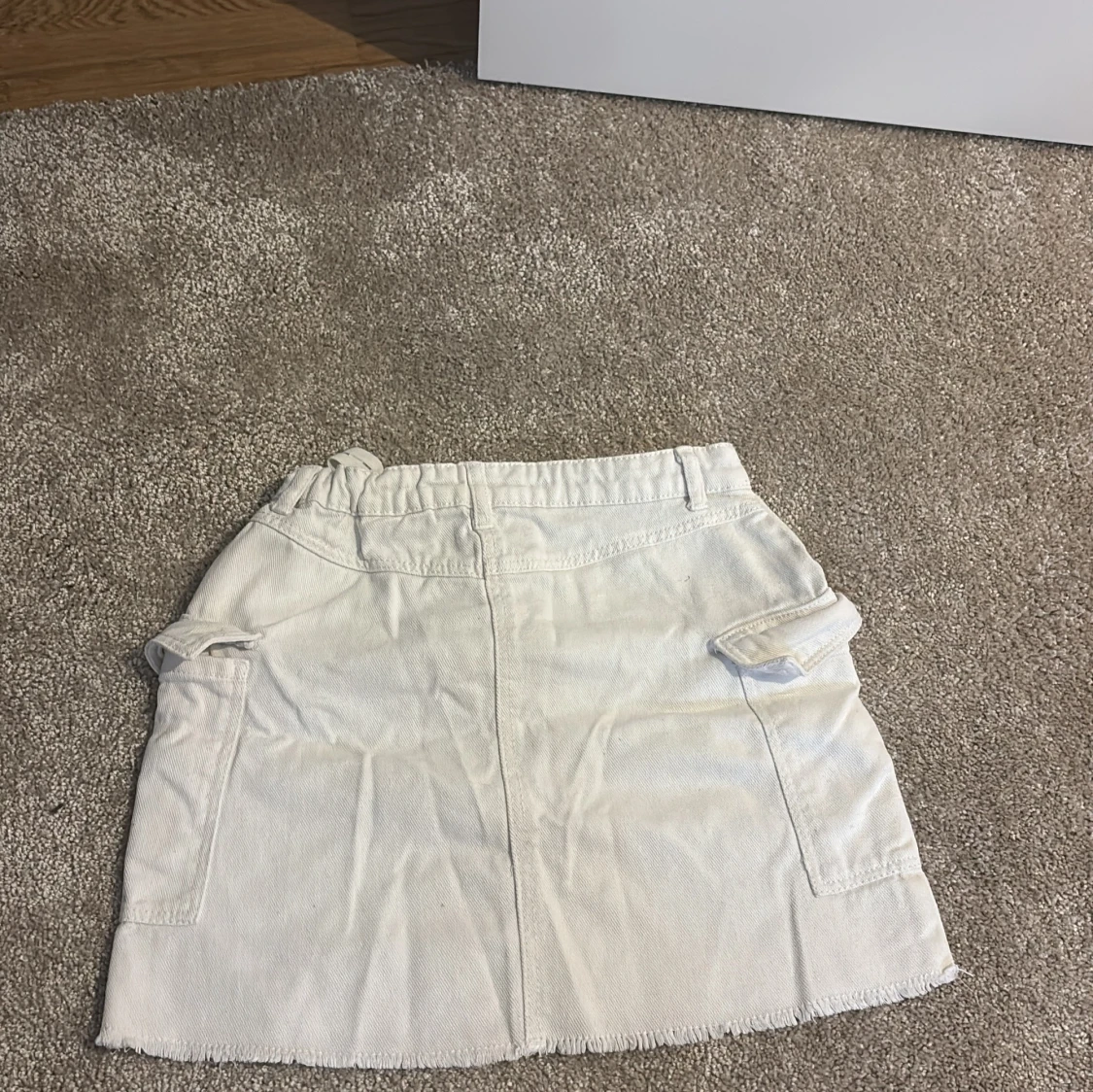 Snygg vit kortkjol från H&M med fransad kant och stora fickor på sidorna. Kjolen har bälteshällor och knappstängning fram. Tillverkad i 100% bomull för en skön och avslappnad känsla. Perfekt för dig som gillar street och utility-vibe.