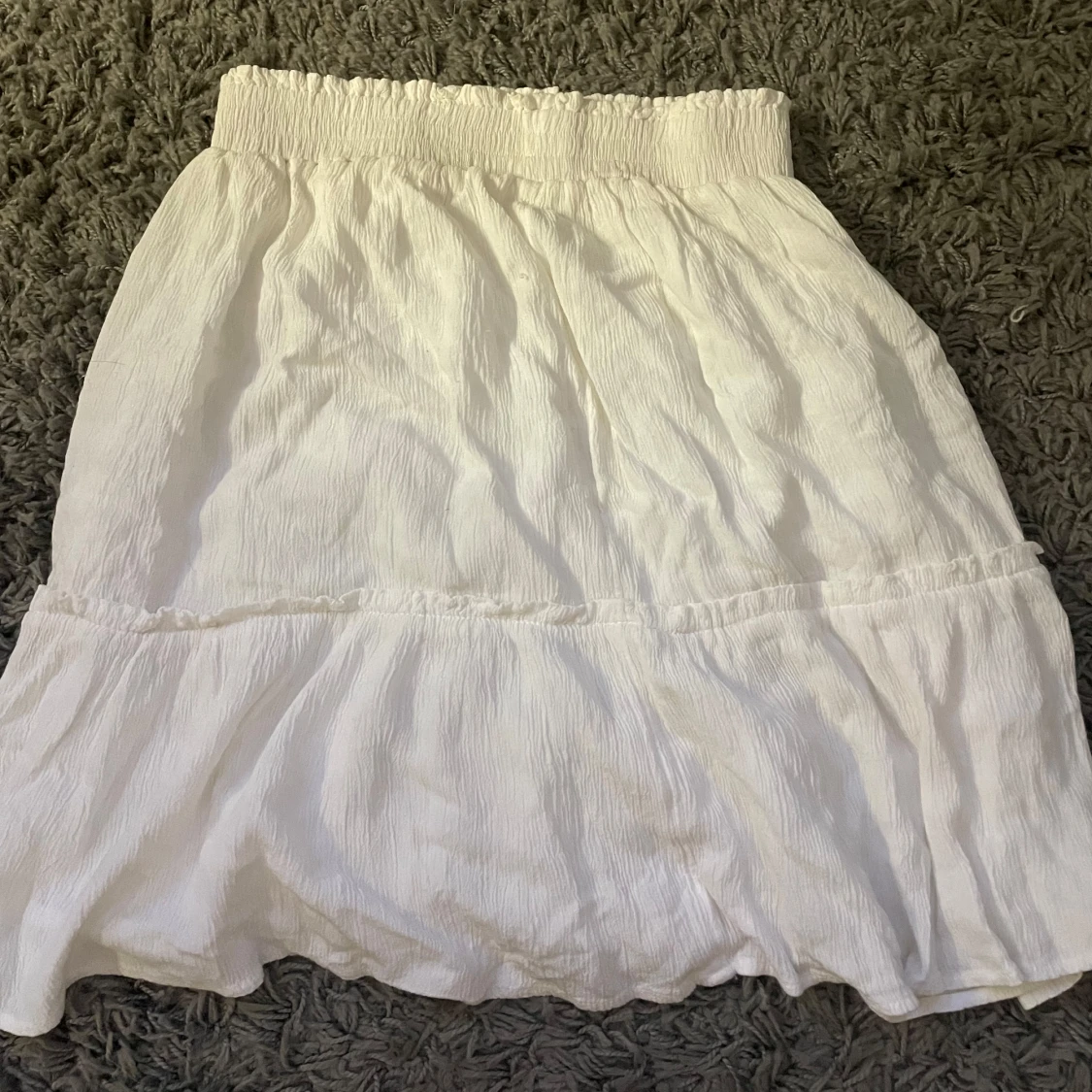 Superfin vit kortkjol med bred resår i midjan och volang nertill. Kjolen är lätt och luftig, perfekt för varma dagar. Enkel att matcha med både toppar och sneakers för en chill look. Kommer från Cubus och är i storlek XS.
