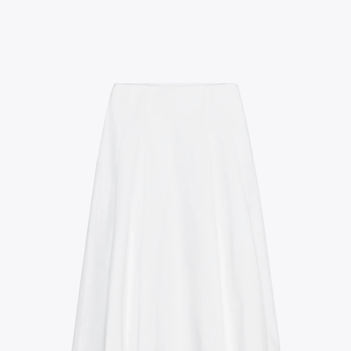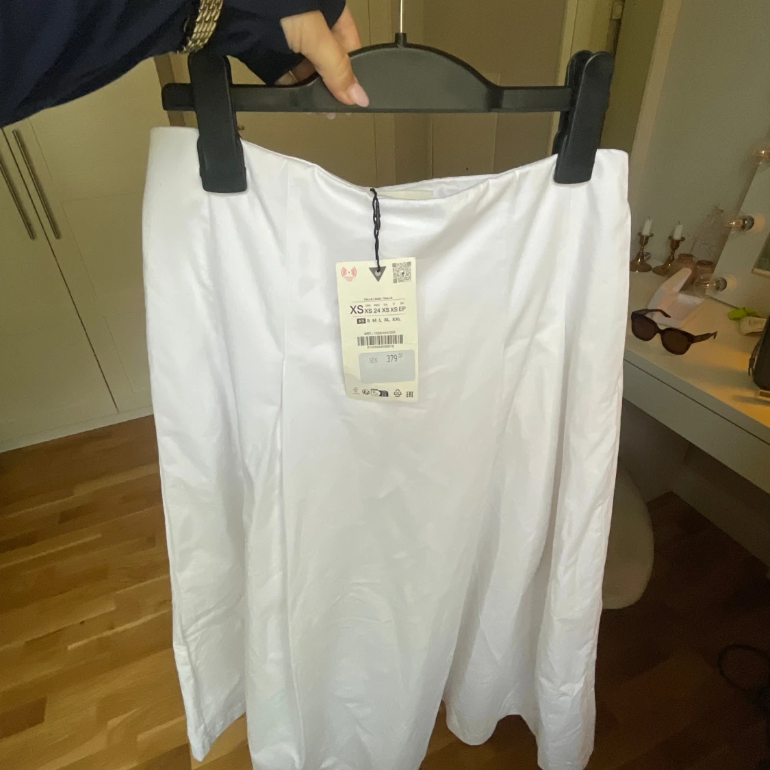 Säljer en stilren vit långkjol i storlek XS. Kjolen har en enkel och klassisk design med lätt utsvängd form och är gjord i bomull. Perfekt för dig som gillar minimalistiska och fräscha outfits.