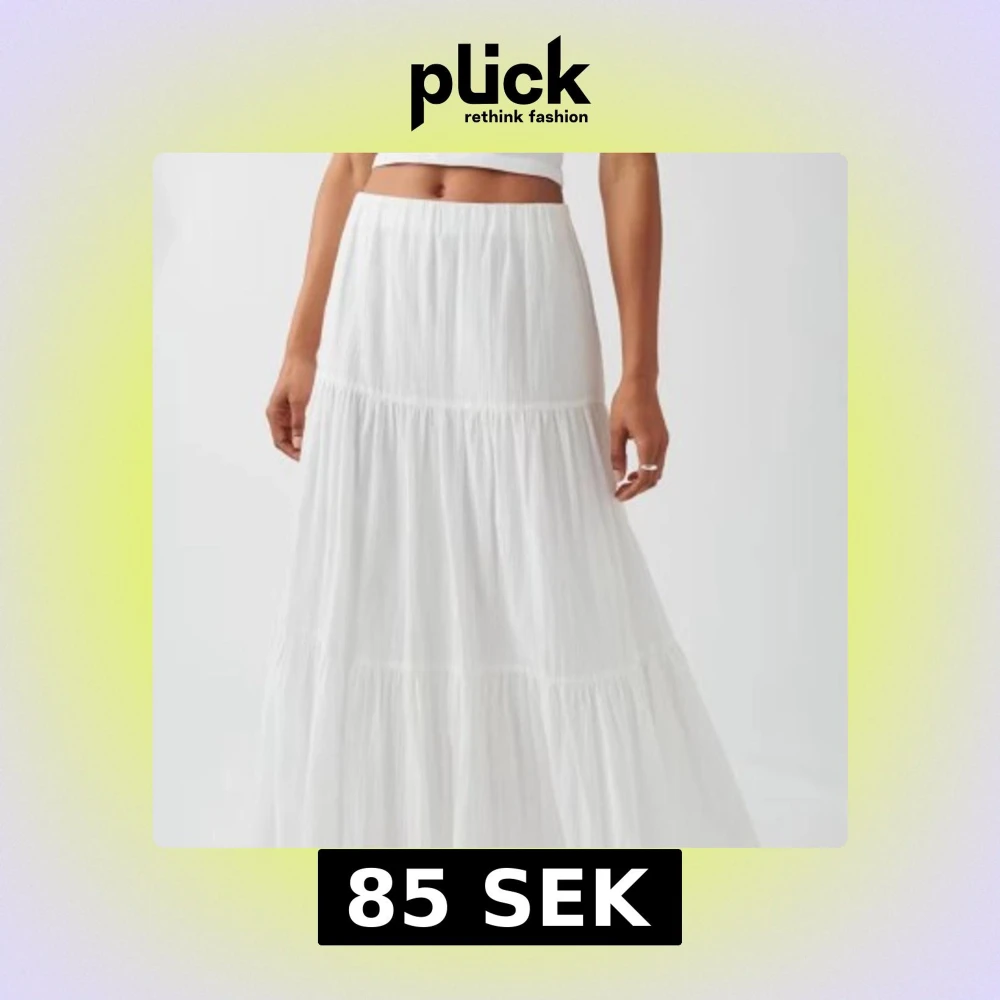 En super snygg långkjol i bomull med resår i midjan. Kjolen är vit och har volanger med rynkade sömmar. Jag är 167 cm och en storlek s täcker mina anklar och de övre delarna av mina fötter✨ inte riktigt min stil längre och därför kommer den inte till användning. Har använt 3-4 gånger. Är dock lite genomskinlig men inget problem med hudfärgade underkläder🥰