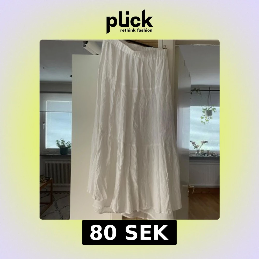 Luftig och flowy vit långkjol med lätt rynkad struktur och resår i midjan. Perfekt för varma dagar och enkel att styla med crop tops eller stickade tröjor. Kjolen har en mjuk och skön känsla tack vare bomullsmaterialet. Ca 80cm lång.