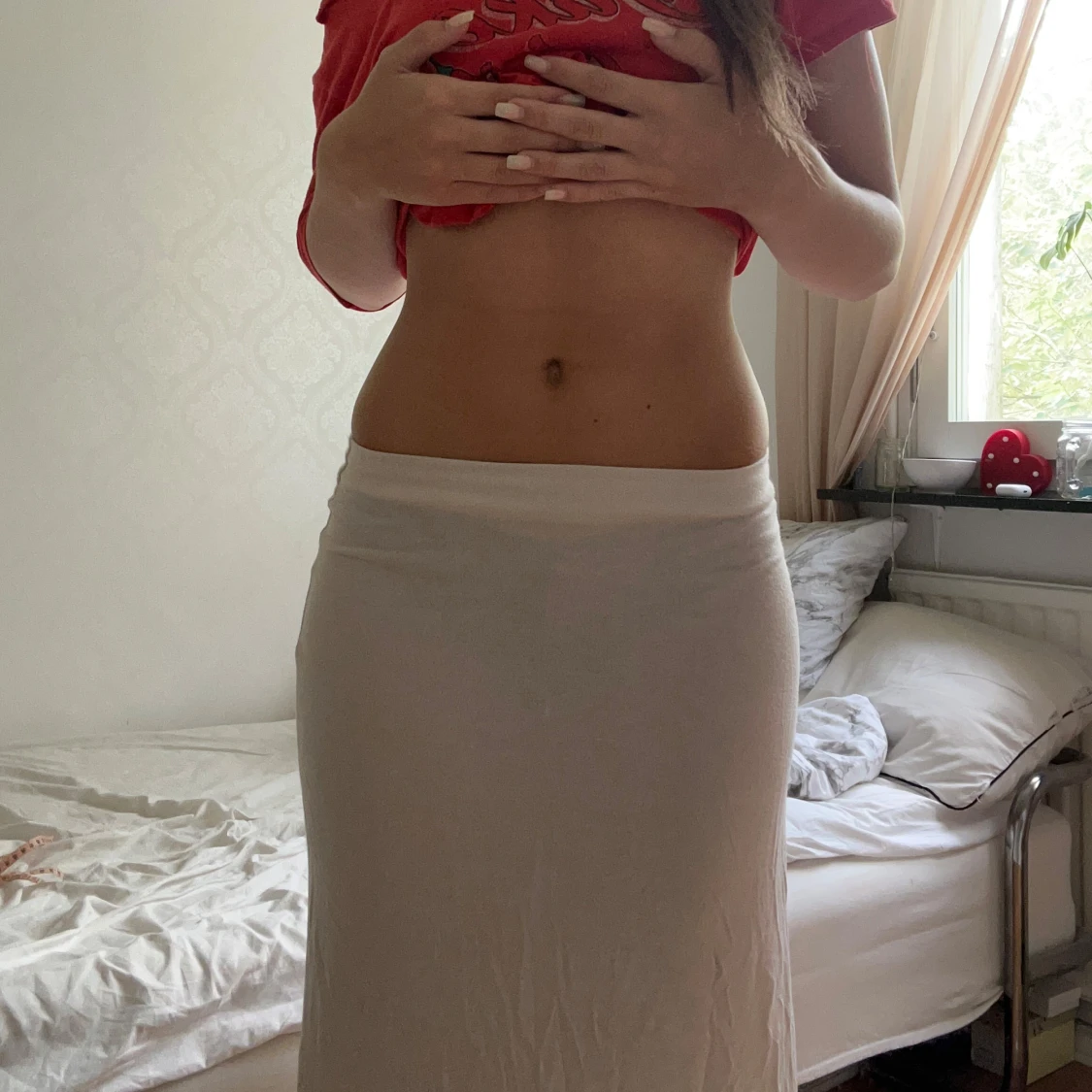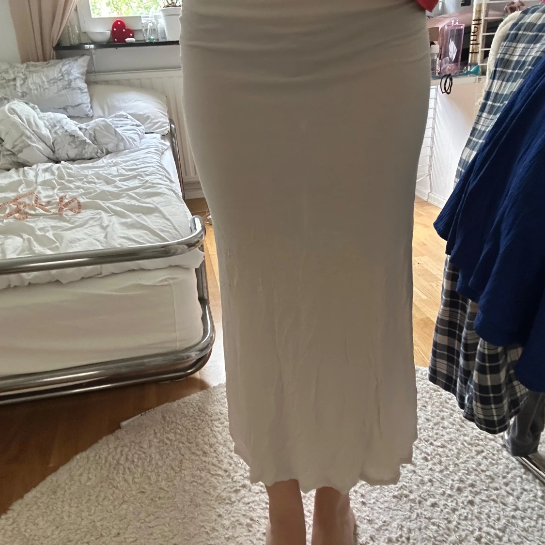 Säljer en enkel och stilren vit långkjol med rak passform. Kjolen är mjuk och följsam, perfekt för dig som gillar minimalistisk stil. Den har ingen synlig dragkedja eller knappar och är lätt att matcha med olika toppar.