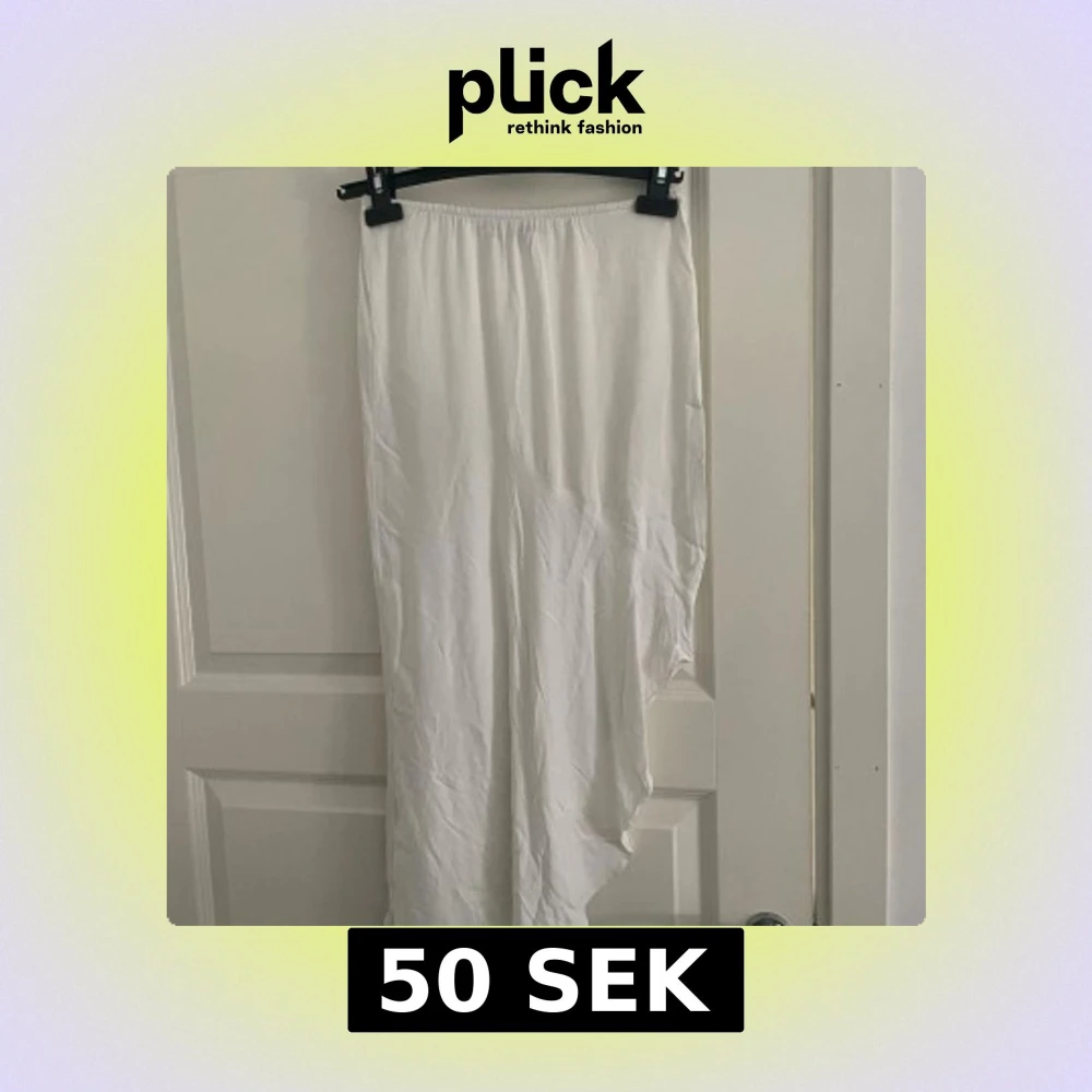 Säljer en vit långkjol med snygg asymmetrisk slits. Kjolen har resår i midjan och är tillverkad i ett lätt och flowy material som passar perfekt till varma dagar. Enkel och stilren design som är lätt att matcha med olika toppar 🤍