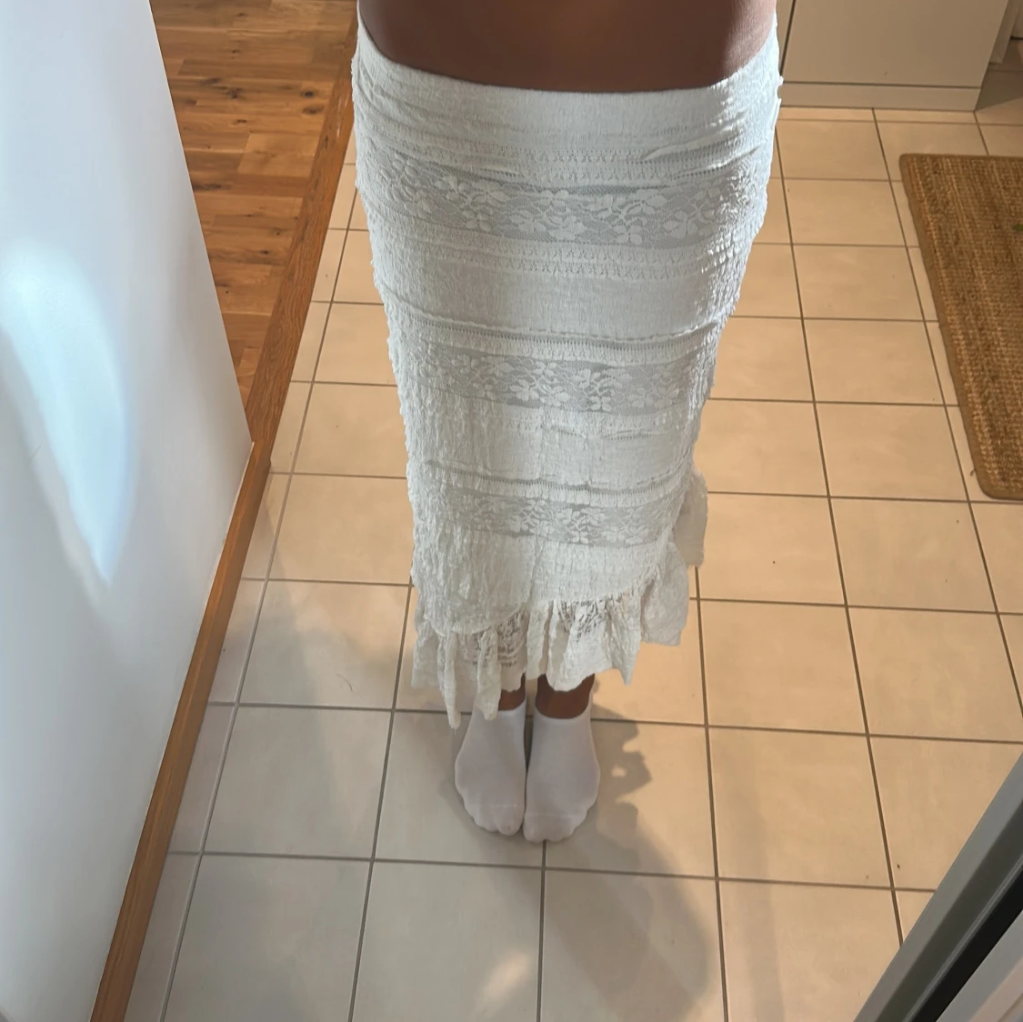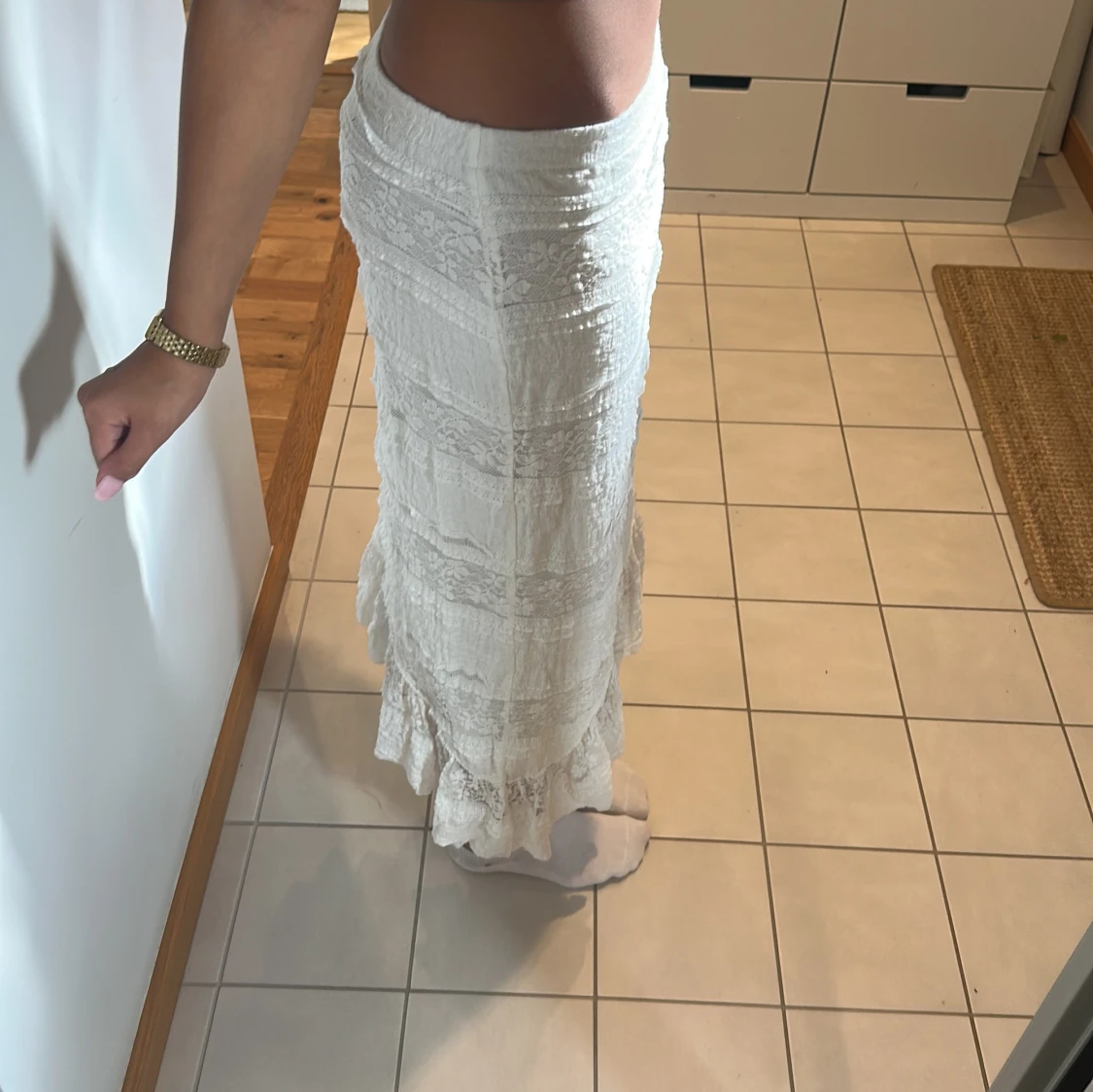 Superfin vit långkjol med spetsdetaljer och volang längst ner. Kjolen har ett romantiskt och bohemiskt uttryck med flera lager av spets och broderade blommor. Perfekt för sommarens alla tillfällen och ger en riktigt fräsch vibe. Kjolen är använd vid ett tillfälle och är väldigt fin till sommaren.