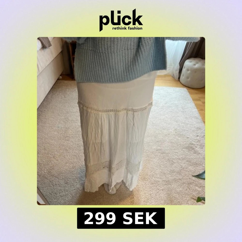 Säljer en vit långkjol med fina spetsdetaljer och lätt rynkad struktur. Kjolen har en bohemisk känsla och är perfekt för varma dagar. Resår i midjan för bekväm passform.