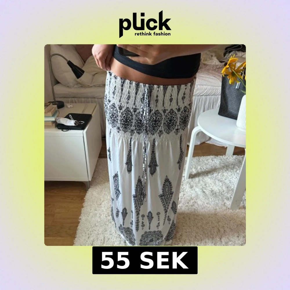 Säljer en vit långkjol med svart paisley-inspirerat mönster. Kjolen har smock i midjan och snörning framtill för en skön passform. Materialet känns lätt och luftigt, perfekt för varma dagar. Mönstret ger en cool boho-vibe och kjolen är riktigt flowy.