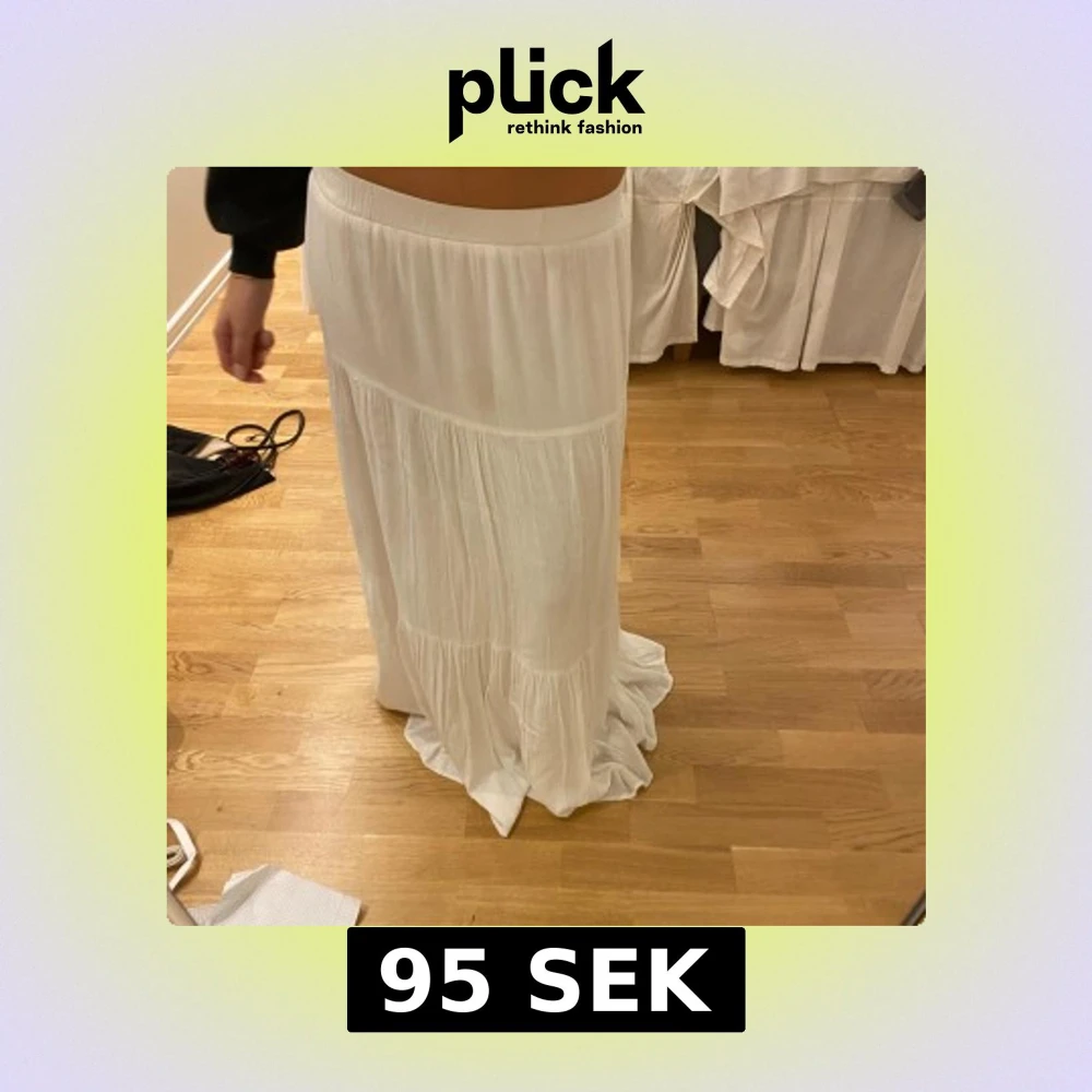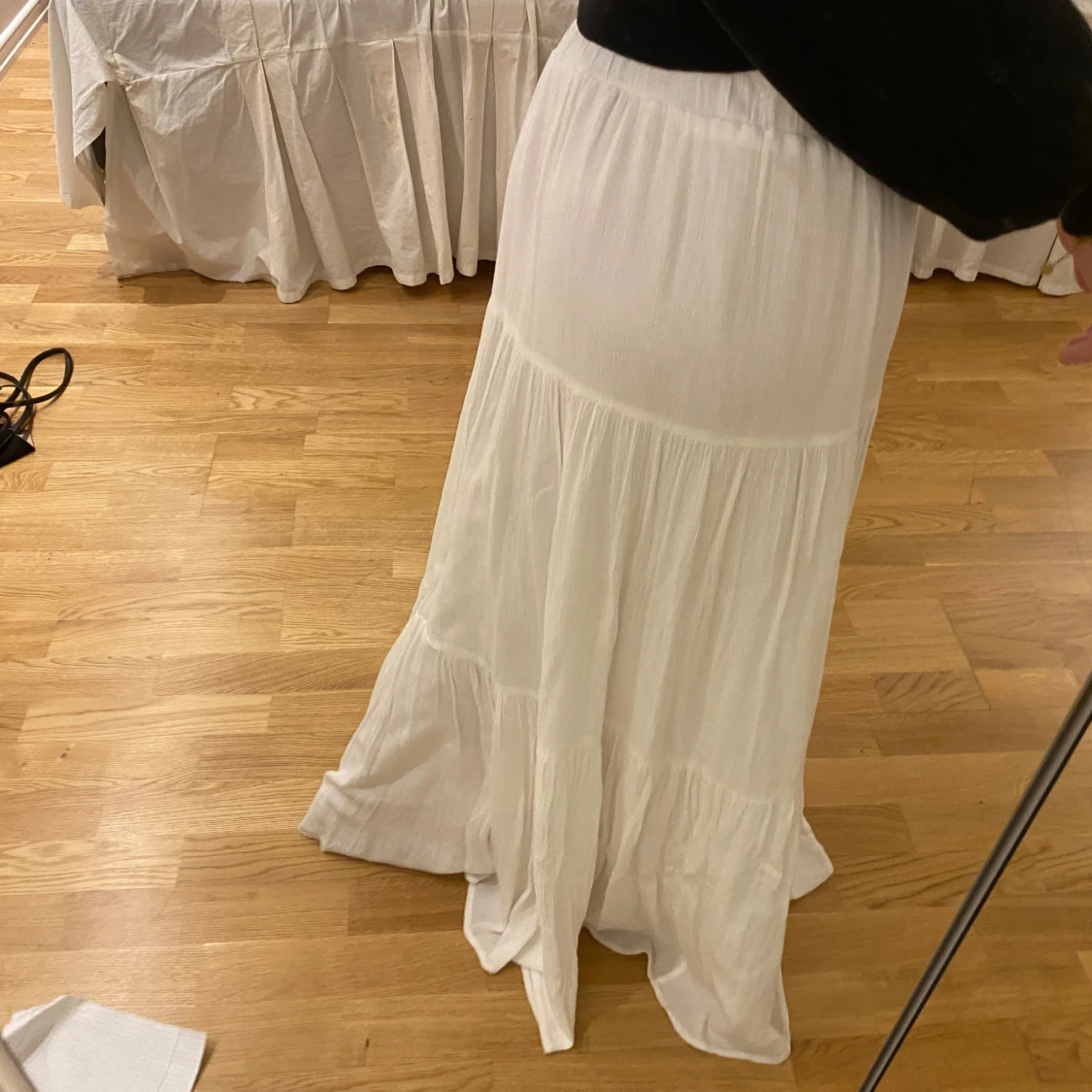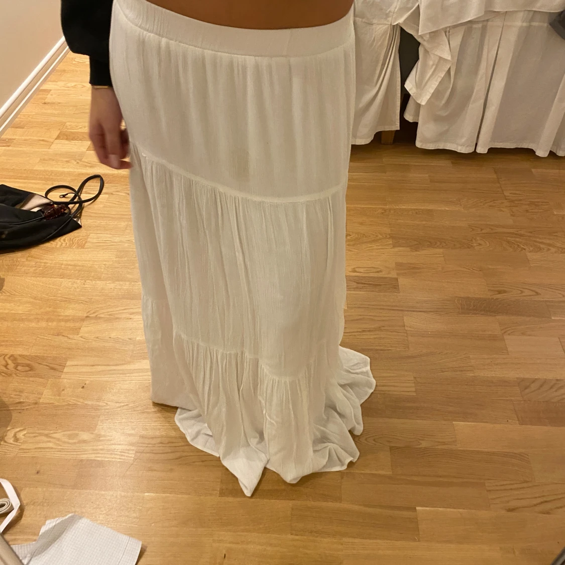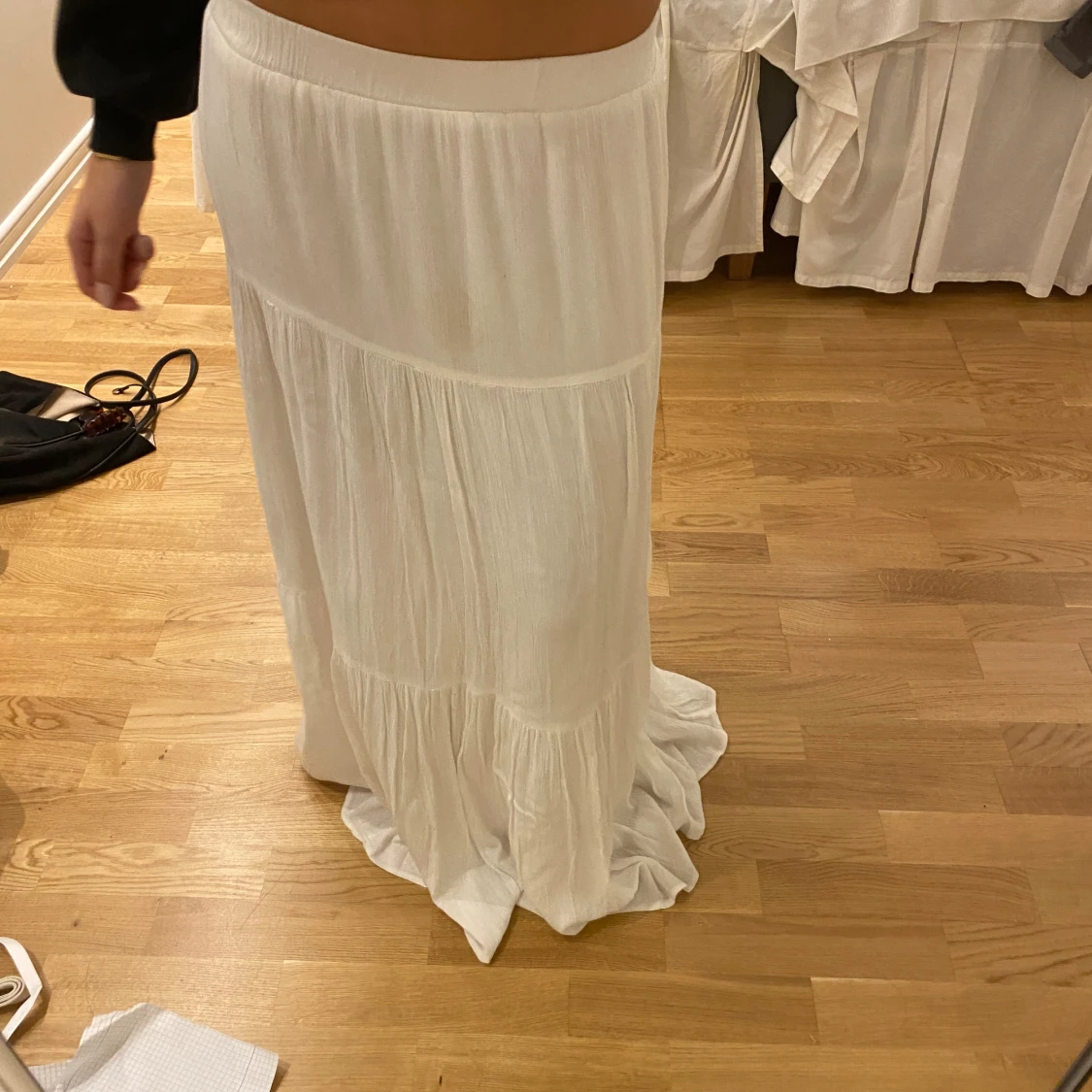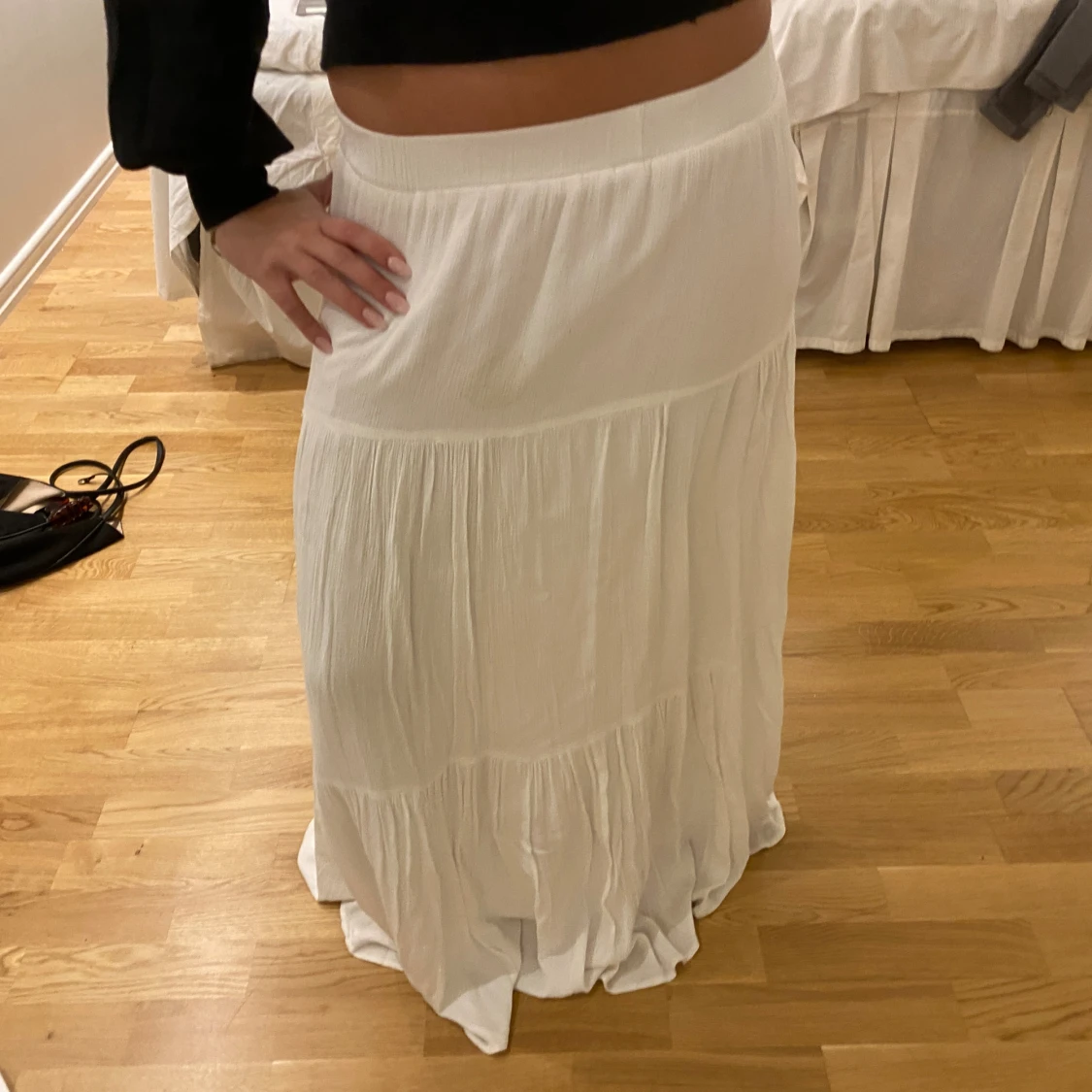 Säljer en vit långkjol med bred resår i midjan och snygga volangdetaljer. Kjolen har ett flowigt fall och är tillverkad i ett lätt, vävt material som känns luftigt och skönt. Perfekt för dig som gillar en bohemisk och chill stil. Vet tyvärr inte vart jag köpr den kom med bud eller skriv om ni har frågor jag tömmer min garderob så gärna snabbt köp!