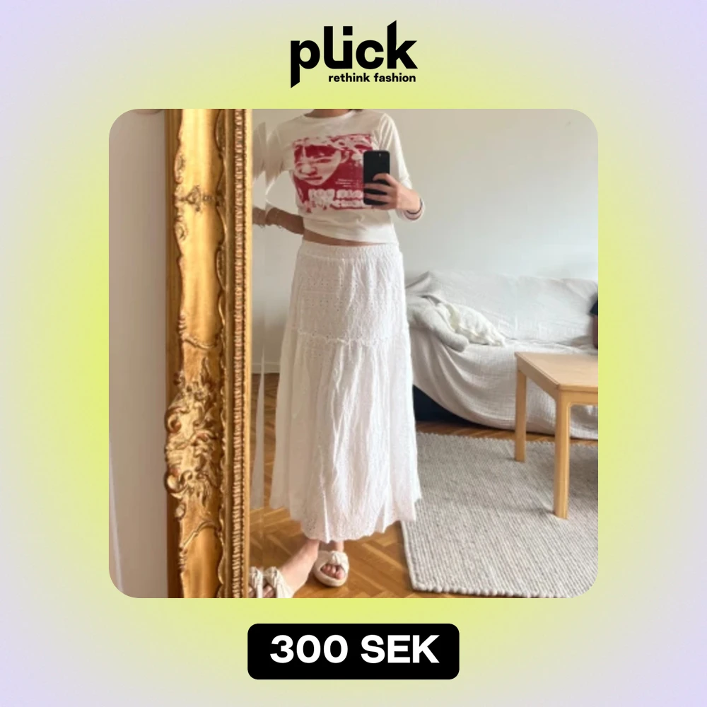 Superfin lång vit maxikjol med fina detaljer! Köpt på Vinted men i nyskick, inga missfärgning eller slitage. Sista bilden är från förra säljaren.