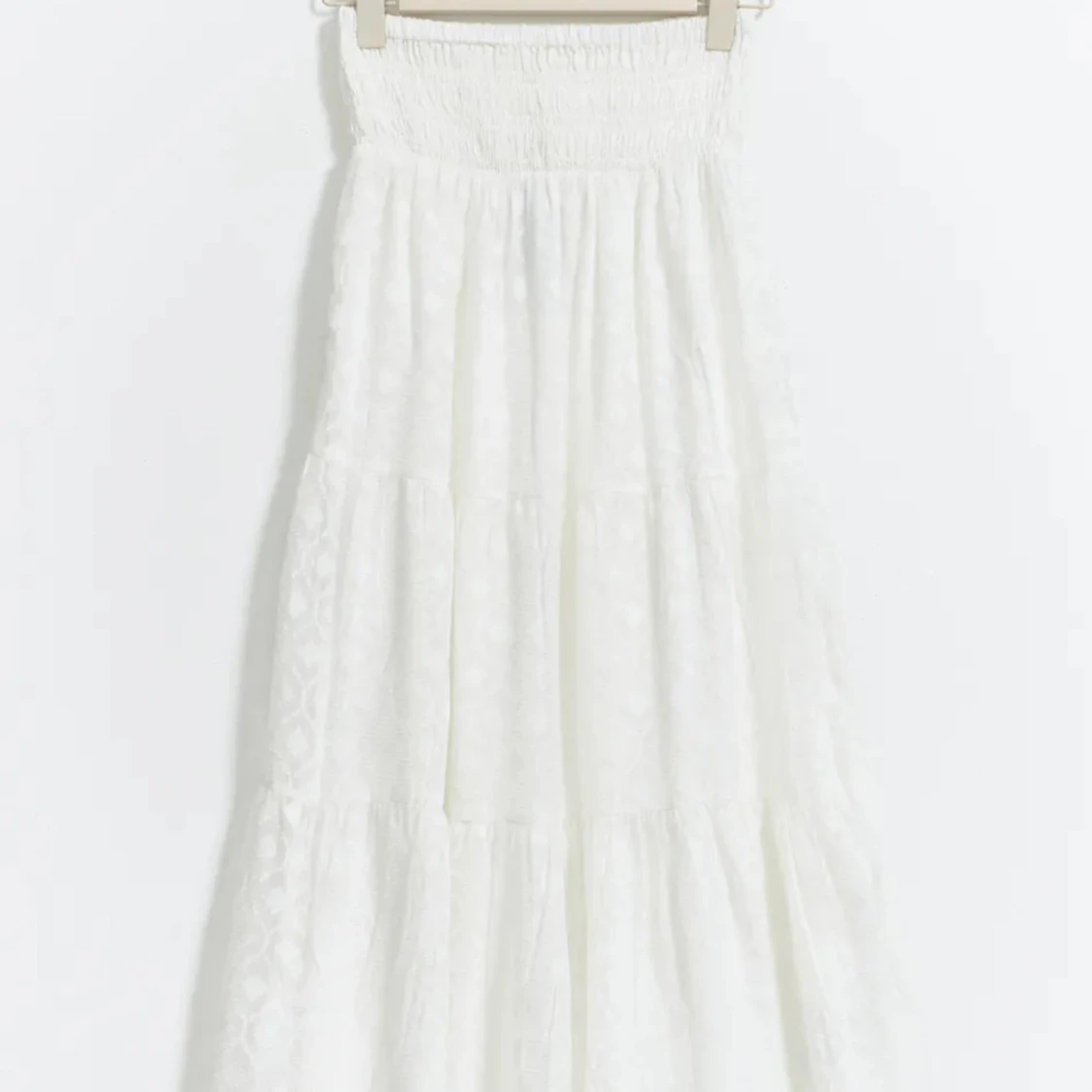 En elegant vit långkjol med ett subtilt mönster. Kjolen har en elastisk midja och är tillverkad i ett lätt och luftigt material, perfekt för varma dagar.