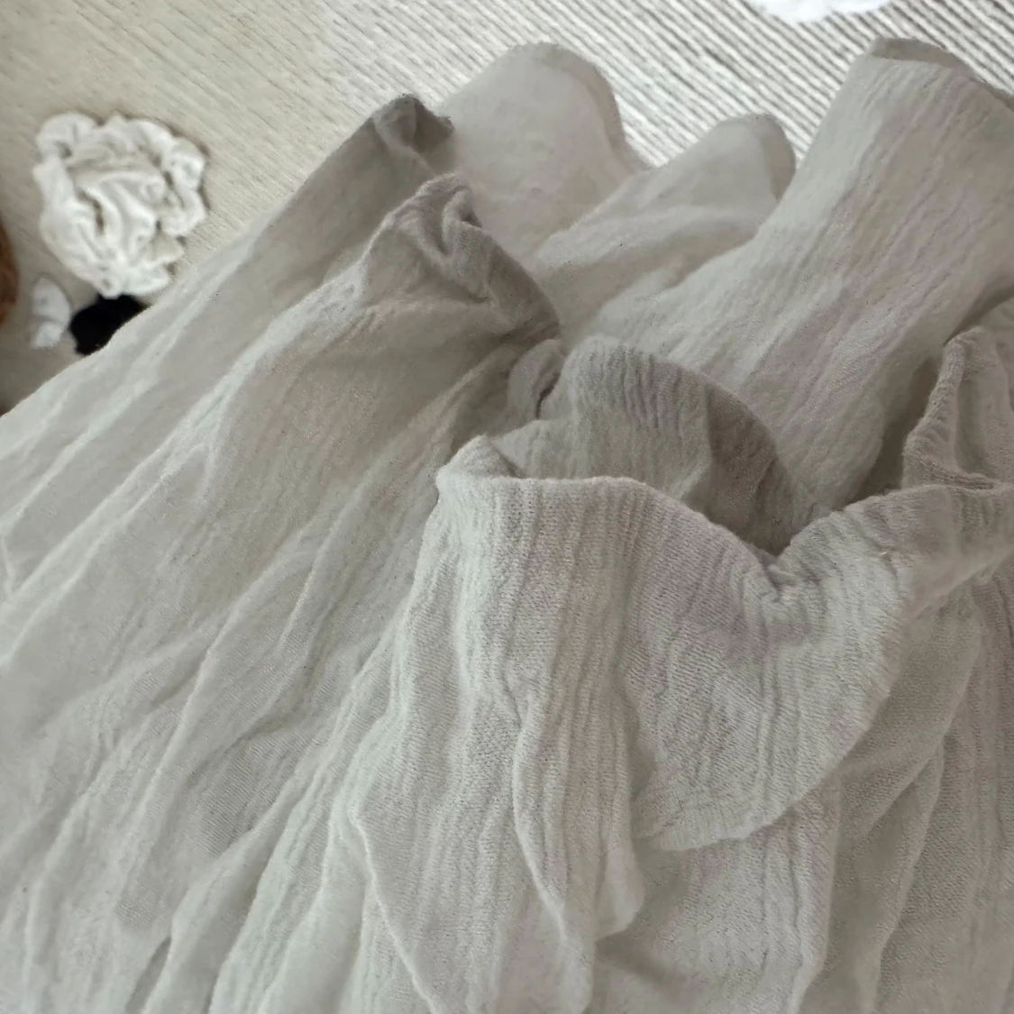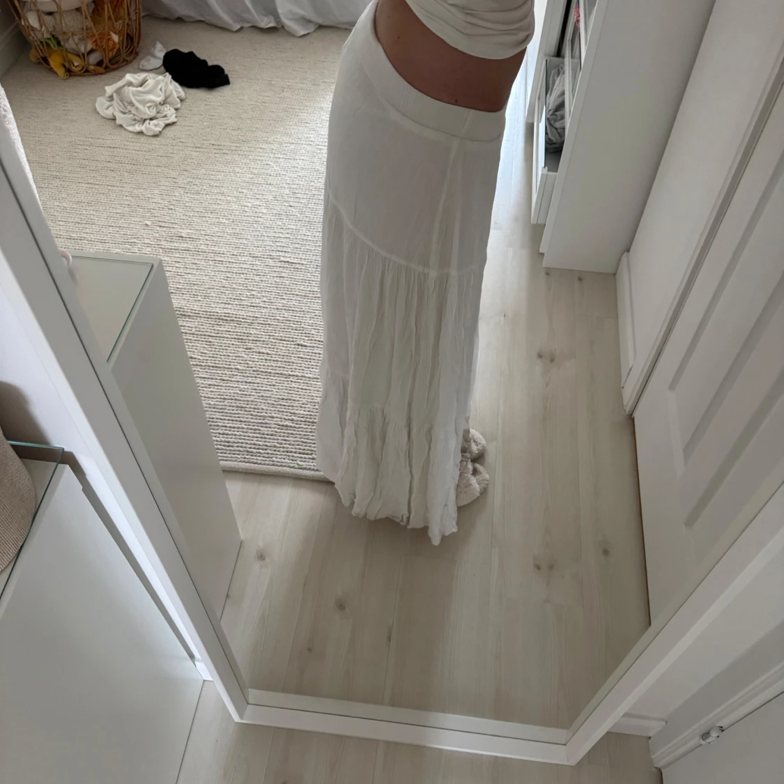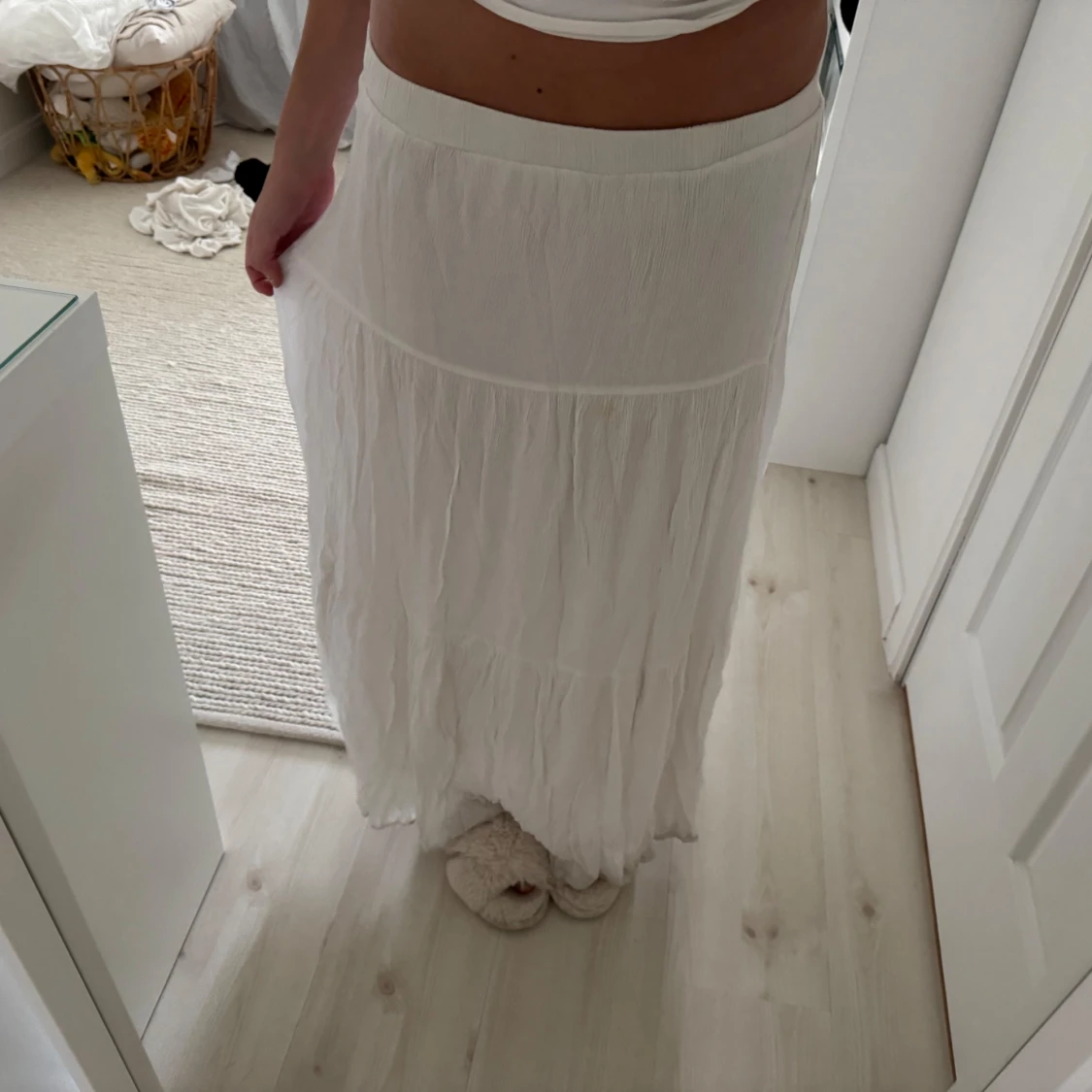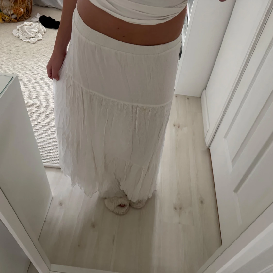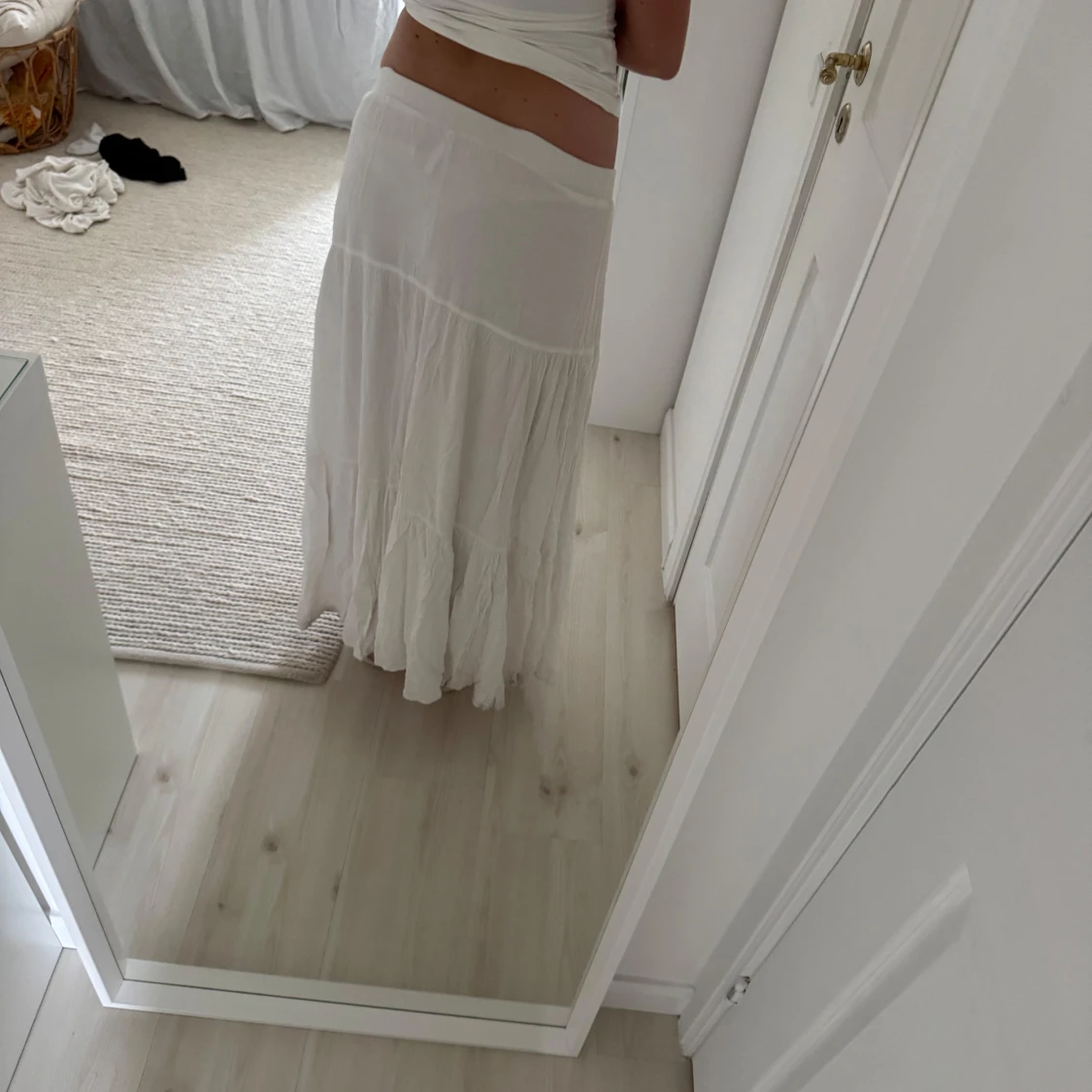 Säljer en flowy vit långkjol med bred resår i midjan och volangdetaljer. Kjolen är tillverkad i tunt, lätt bomullstyg som ger en luftig känsla. Perfekt för varma dagar och enkel att styla med crop tops eller linnen. Har fläckar längst ned
